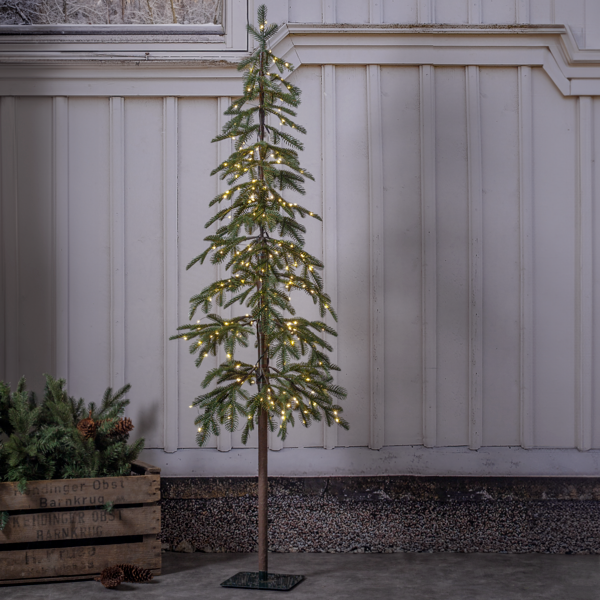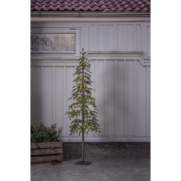 Wąskie drzewko świąteczne z asymetrycznymi gałązkami i ciepłymi diodami LED, umieszczone na czarnym metalowym stojaku na białym tle.