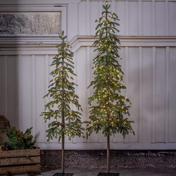 Smukłe sztuczne drzewko iglaste LED o naturalnym pokroju, ustawione przy białej elewacji zewnętrznej, z subtelnym ciepłym oświetleniem w gałązkach.