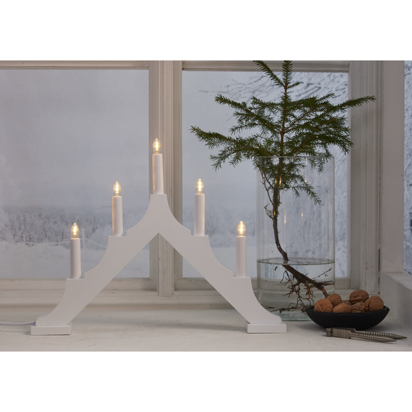 Biały drewniany świecznik to stylowa i ponadczasowa dekoracja, która wnosi do wnętrza magiczny blask świąt. Klasyczna forma z nowoczesnym akcentem sprawia, że doskonale prezentuje się na parapecie, półce czy komodzie, dodając aranżacji elegancji i przytulnego charakteru. Subtelne światło pięciu świeczek tworzy wyjątkową atmosferę spokoju i harmonii, idealną na długie zimowe wieczory. Dzięki wymiennym żarówkom typu E10 z łatwością dopasujesz intensywność i barwę światła do swoich preferencji. Wykonany z drewna posiadającego certyfikat FSC®, świecznik łączy piękny design z odpowiedzialnym podejściem do środowiska, a zasilanie 230V zapewnia wygodę i niezawodne użytkowanie.