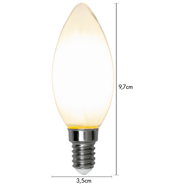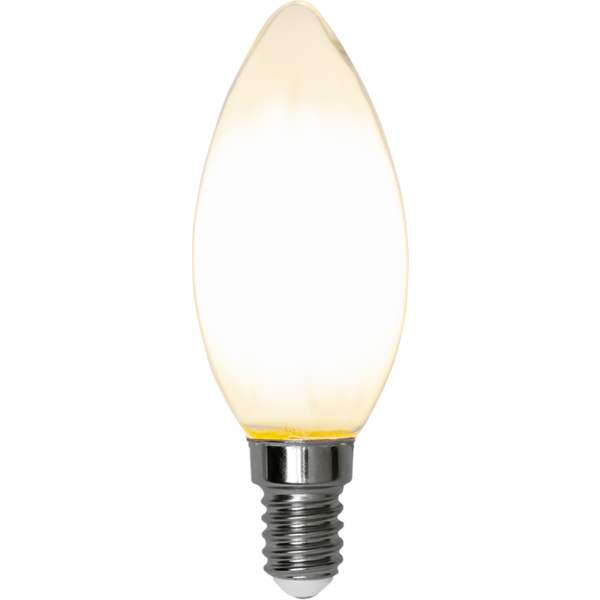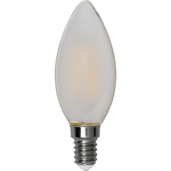Żarówka LED E14 świecowa z mlecznym kloszem, emitująca ciepłe białe światło, widok frontalny na białym tle.