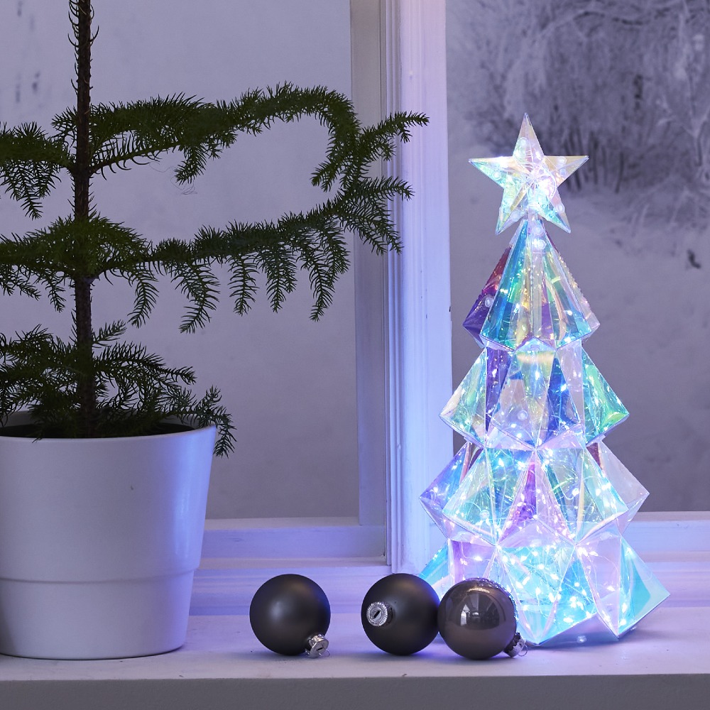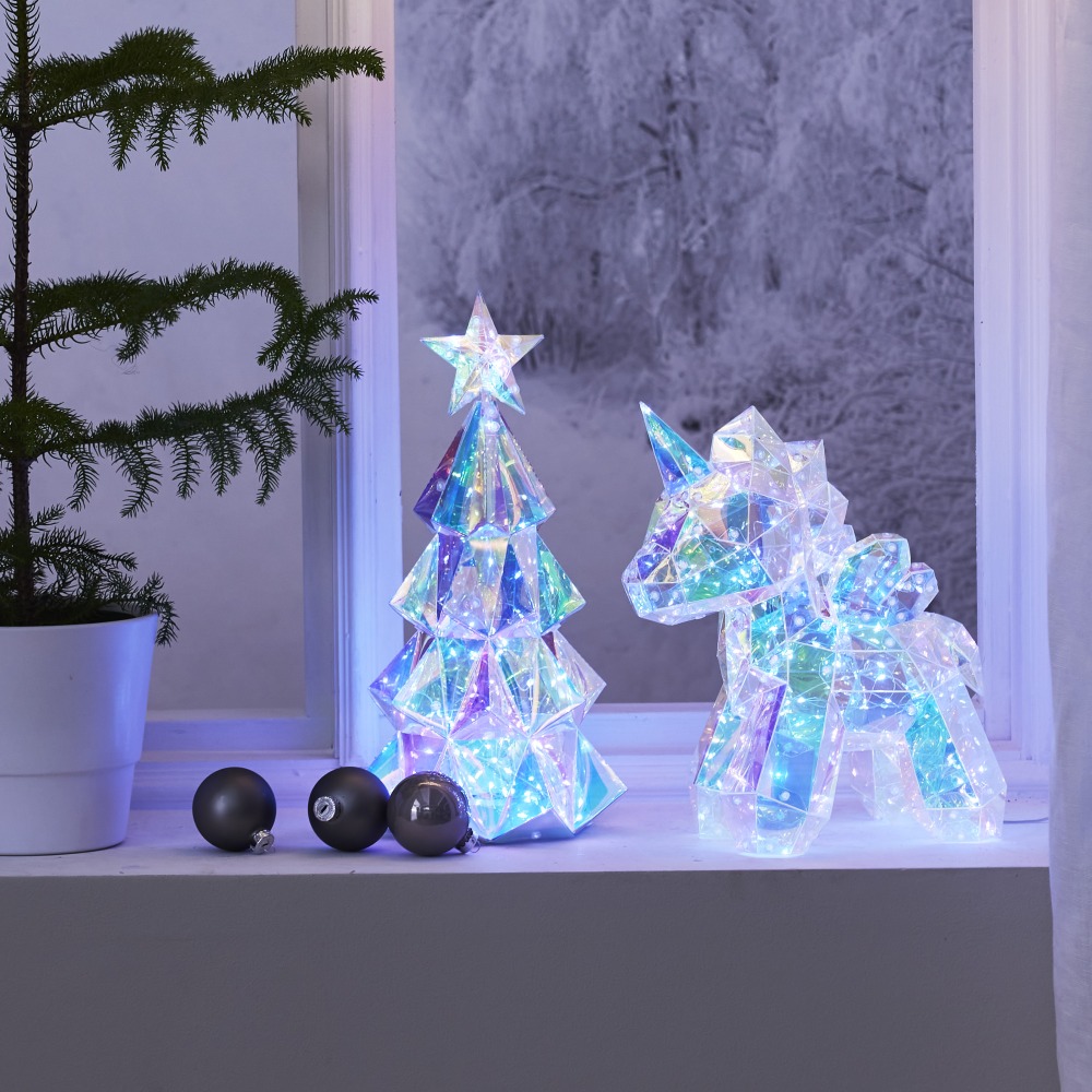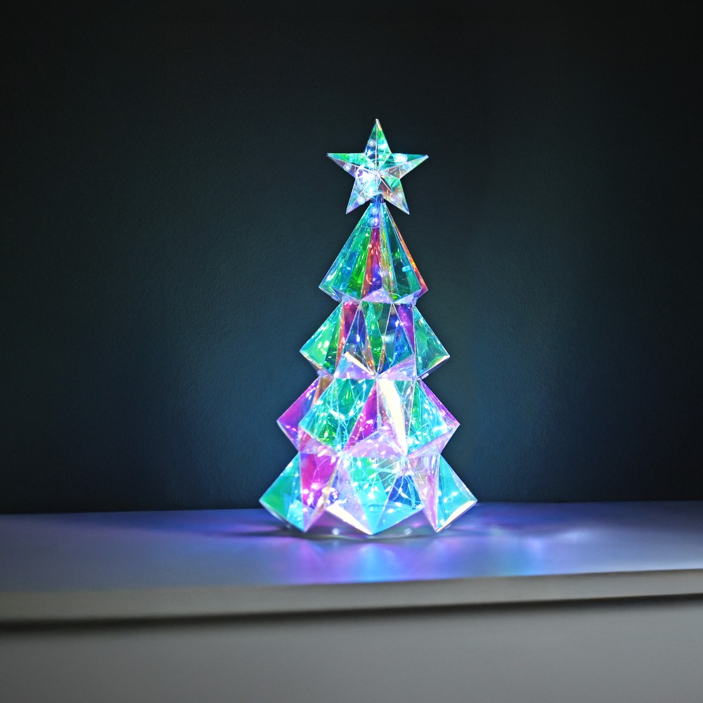 Choinka LED w tęczowych barwach to nowoczesna dekoracja świąteczna, która zachwyca blaskiem i kolorową poświatą. Jej geometryczna forma pięknie odbija światło, tworząc efekt mieniących się kryształów. Idealna do wnętrz, w których liczy się oryginalność i wyjątkowy klimat.