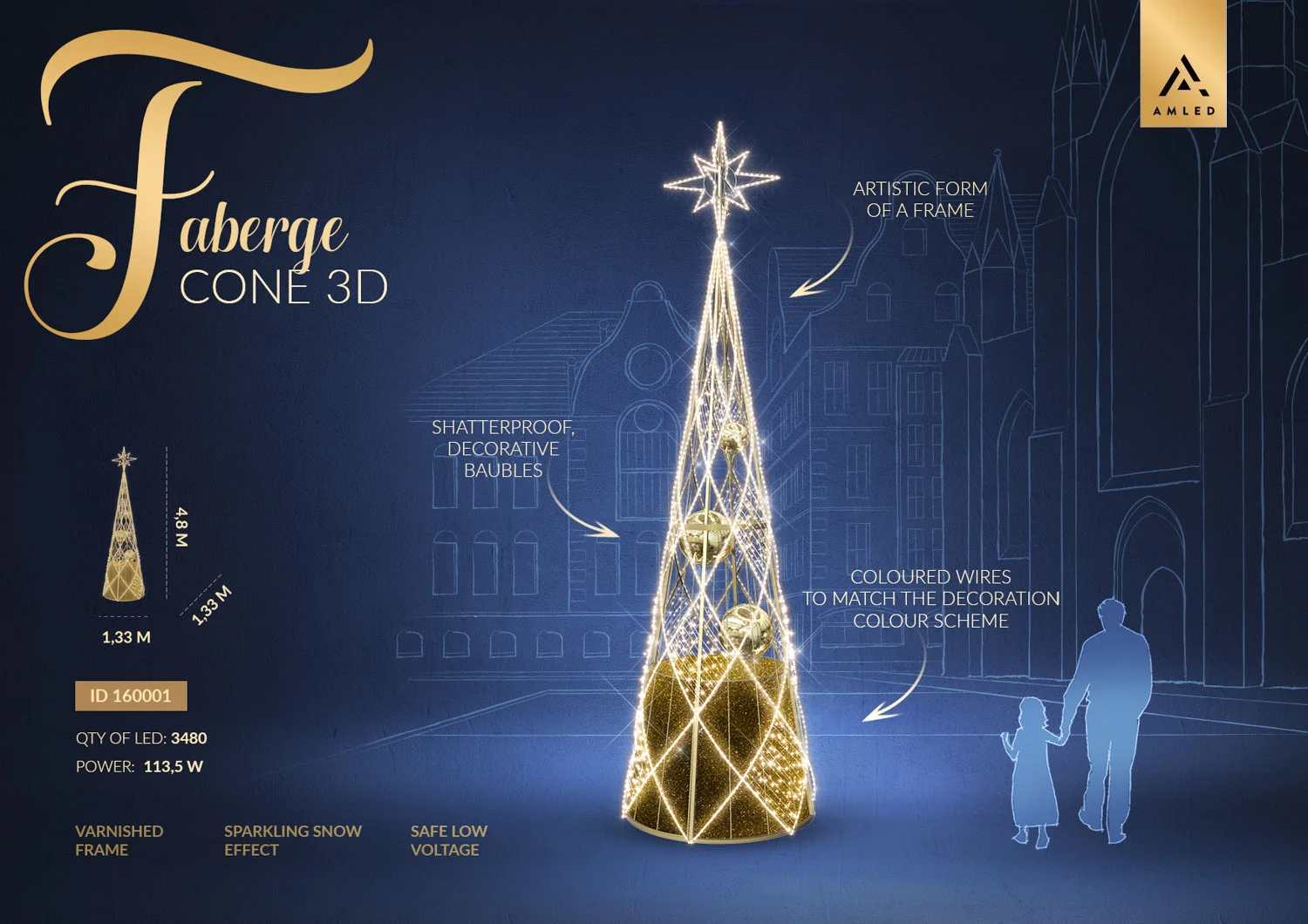 Lekka i bezpieczna konstrukcja – choinka o wysokości 4,8 metra oparta jest na modułowym stelażu wykonanym z aluminium, co zapewnia dużą wytrzymałość przy niskiej wadze. Dzięki zastosowaniu energooszczędnych diod LED (3480 punktów świetlnych), dekoracja emituje intensywny blask przy niskim poborze mocy. System niskonapięciowy gwarantuje bezpieczne użytkowanie także w przestrzeniach publicznych.