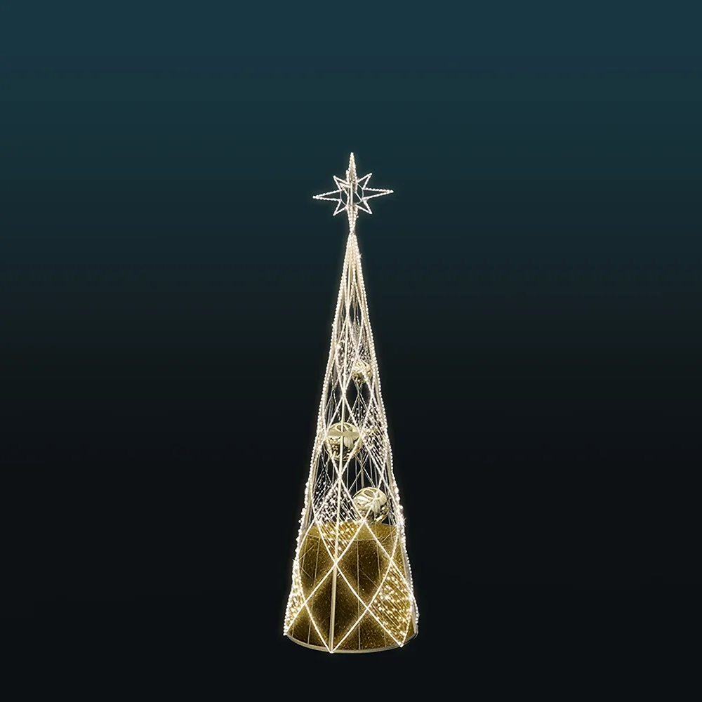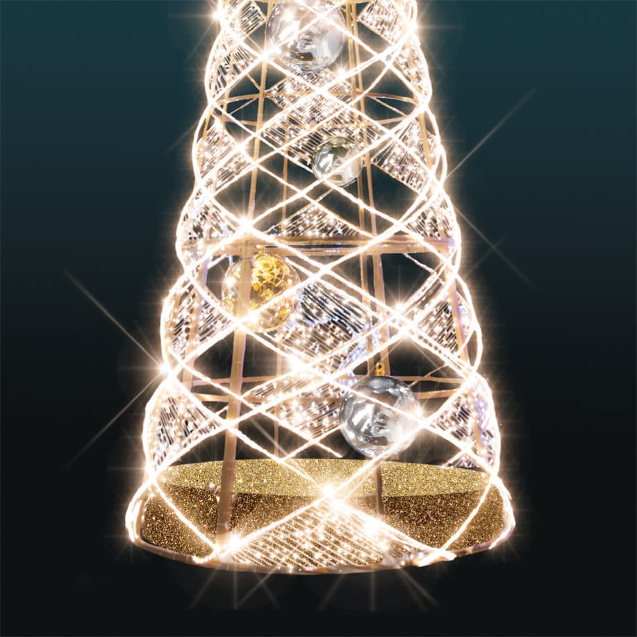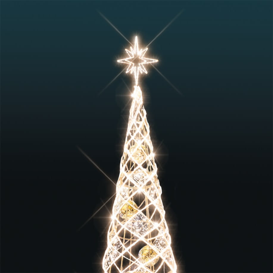 Przestrzenna forma i świetlna precyzja – lekkie linie LED oplatają geometryczną konstrukcję, tworząc trójwymiarowy wzór z efektem skrzącego śniegu. Wewnątrz dekoracji umieszczono nietłukące, błyszczące bombki, a wszystkie przewody zostały dopasowane kolorystycznie do całości, co podkreśla estetyczną spójność projektu. Całość wieńczy efektowna gwiazda LED na szczycie.