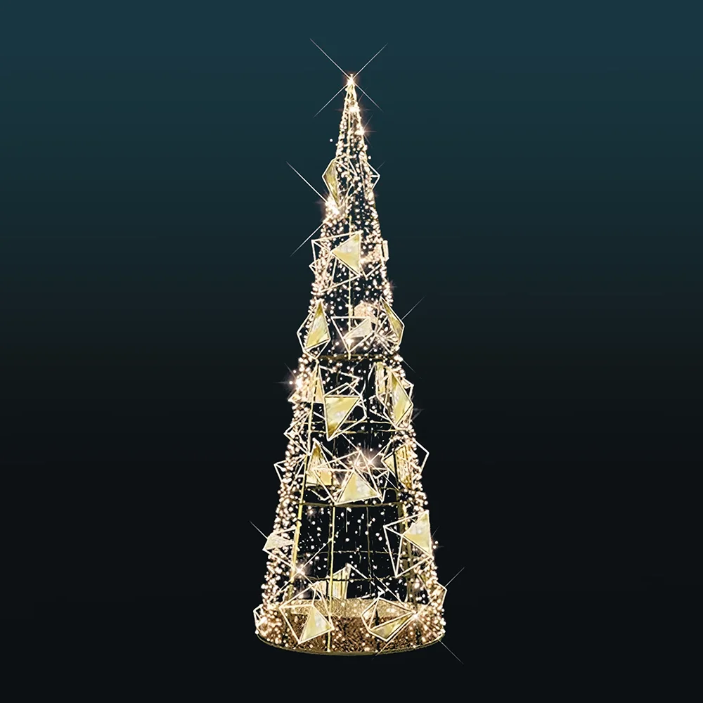 Stożkowa choinka LED z lustrzanymi diamentami i migoczącymi światełkami. Konstrukcja oświetlona ciepłym światłem, z dekoracjami w kształcie geometrycznych form na tle ciemnym.