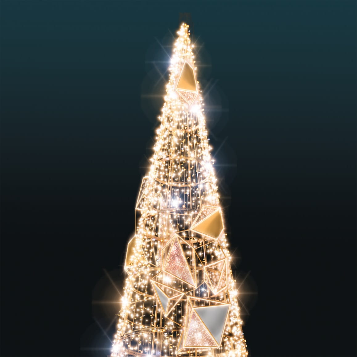 Geometryczna elegancja i świetlny blask – choinka o wysokości 8 metrów zaskakuje nietuzinkową formą. Lustrzane struktury w kształcie diamentów efektownie odbijają światło, tworząc dynamiczną grę refleksów. Migoczące punkty LED dają efekt skrzącego śniegu, który ożywia całą kompozycję.