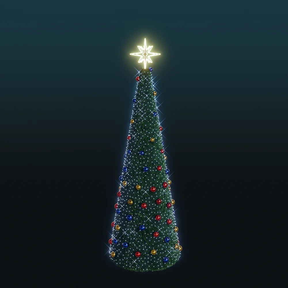 Choinka stożkowa LED o wysokości 5,8 m z kolorowymi bombkami i świetlistą gwiazdą na szczycie, oświetlona białymi punktami LED, tworzącymi efekt skrzącego śniegu.
