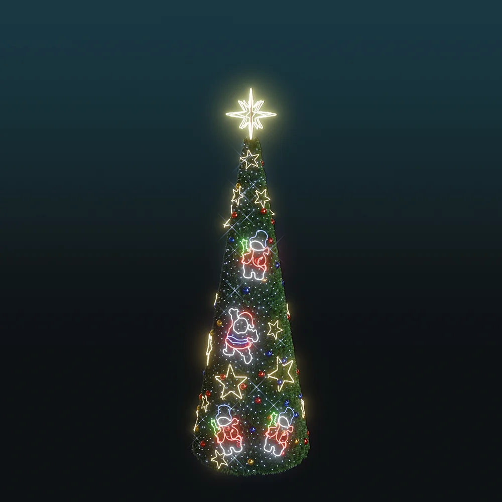Choinka STOŻKOWA Z GWIAZDKAMI, MIKOŁAJAMI I BAŁWANKAMI to efektowna dekoracja świetlna o wysokości 5,8 metra, która łączy nowoczesną technologię LED z klasycznymi motywami świątecznymi. Neonowe sylwetki postaci i gwiazdek przyciągają uwagę z dużej odległości, tworząc niezwykle radosny, bajkowy klimat.