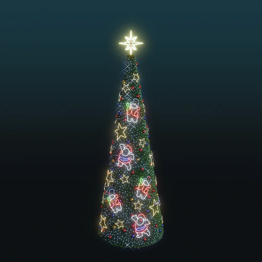 Choinka STOŻKOWA Z GWIAZDKAMI, MIKOŁAJAMI I BAŁWANKAMI to efektowna dekoracja świetlna o wysokości 6,8 metra, która łączy nowoczesną technologię LED z klasycznymi motywami świątecznymi. Neonowe sylwetki postaci i gwiazdek przyciągają uwagę z dużej odległości, tworząc niezwykle radosny, bajkowy klimat.