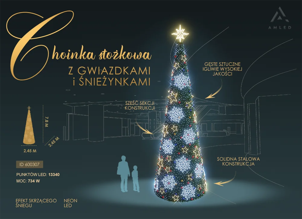 Choinka STOŻKOWA z GWIAZDKAMI i ŚNIEŻYNKAMI to efektowna dekoracja świetlna o wysokości 7,8 metra, która wprowadza do przestrzeni miejskiej bajkowy klimat zimowych świąt. Jej wysoka, symetryczna forma wypełniona barwnymi punktami świetlnymi tworzy imponującą iluminację, przyciągając spojrzenia z daleka. Świetliste gwiazdy i śnieżynki LED nadają całości magicznego charakteru.