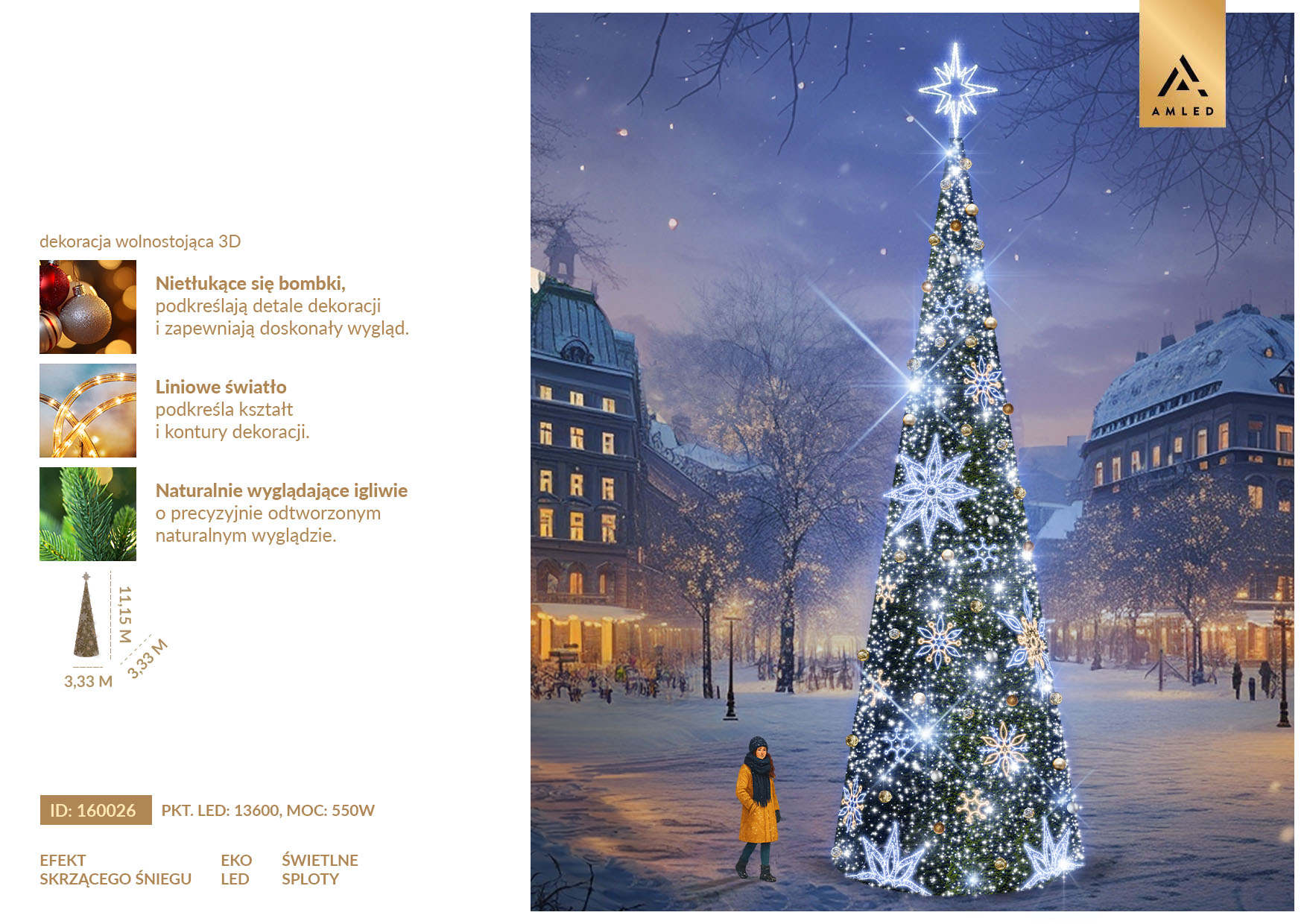 Choinka STOŻKOWA z MOTYWEM ŚNIEŻYNKI to imponująca dekoracja świąteczna o wysokości 11,15 metra, która wyróżnia się chłodną kolorystyką i niezwykłym świetlnym blaskiem. Dzięki efektownym śnieżynkom LED wplecionym w realistyczne igliwie, tworzy spektakularną, zimową atmosferę zarówno w dzień, jak i po zmroku.