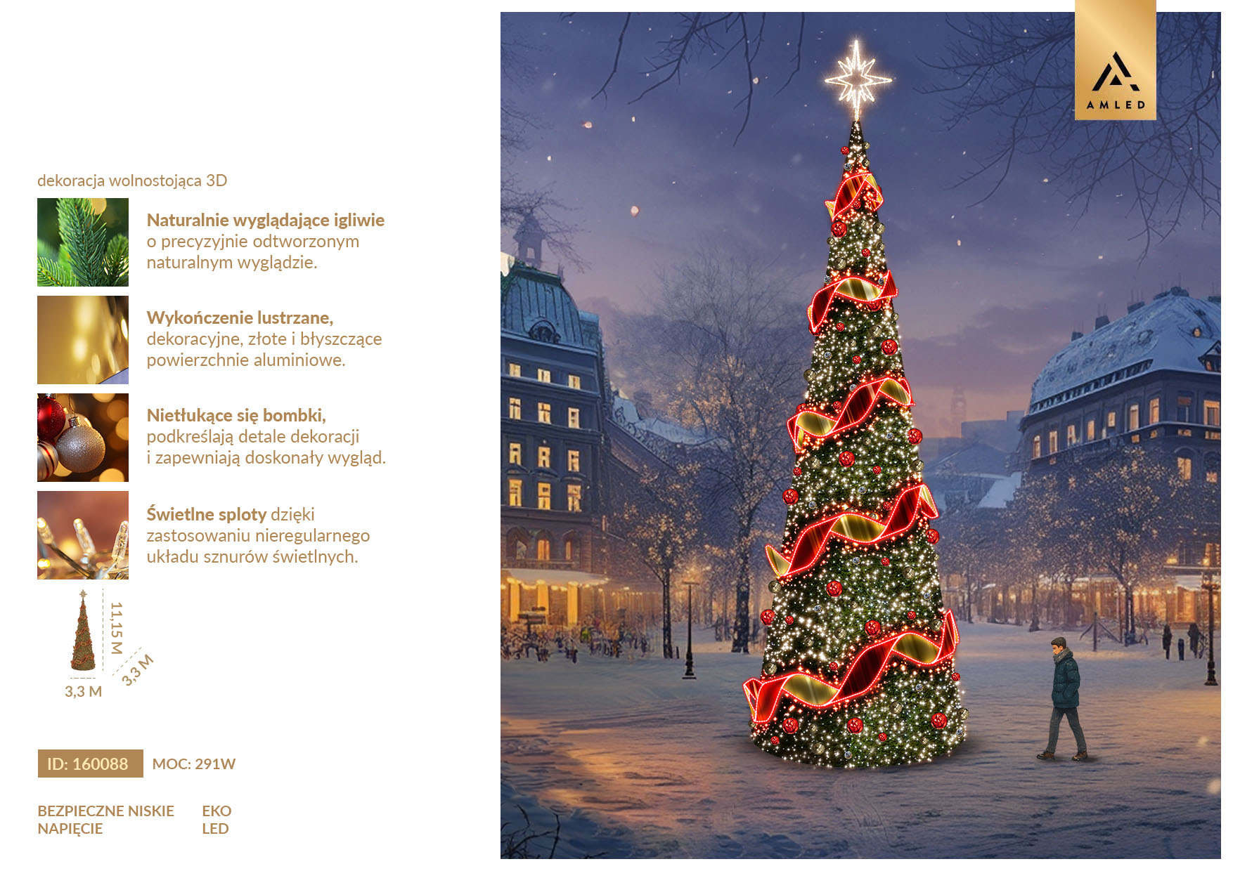 Choinka STOŻKOWA z CZERWONĄ WSTĄŻKĄ to efektowna dekoracja świąteczna o wysokości 11,15 metra, która łączy klasyczny wygląd z eleganckimi, nowoczesnymi akcentami. Dzięki intensywnie czerwonej, przestrzennej wstędze oplatającej igliwie, całość prezentuje się wyjątkowo stylowo i przyciąga wzrok z dużej odległości.
