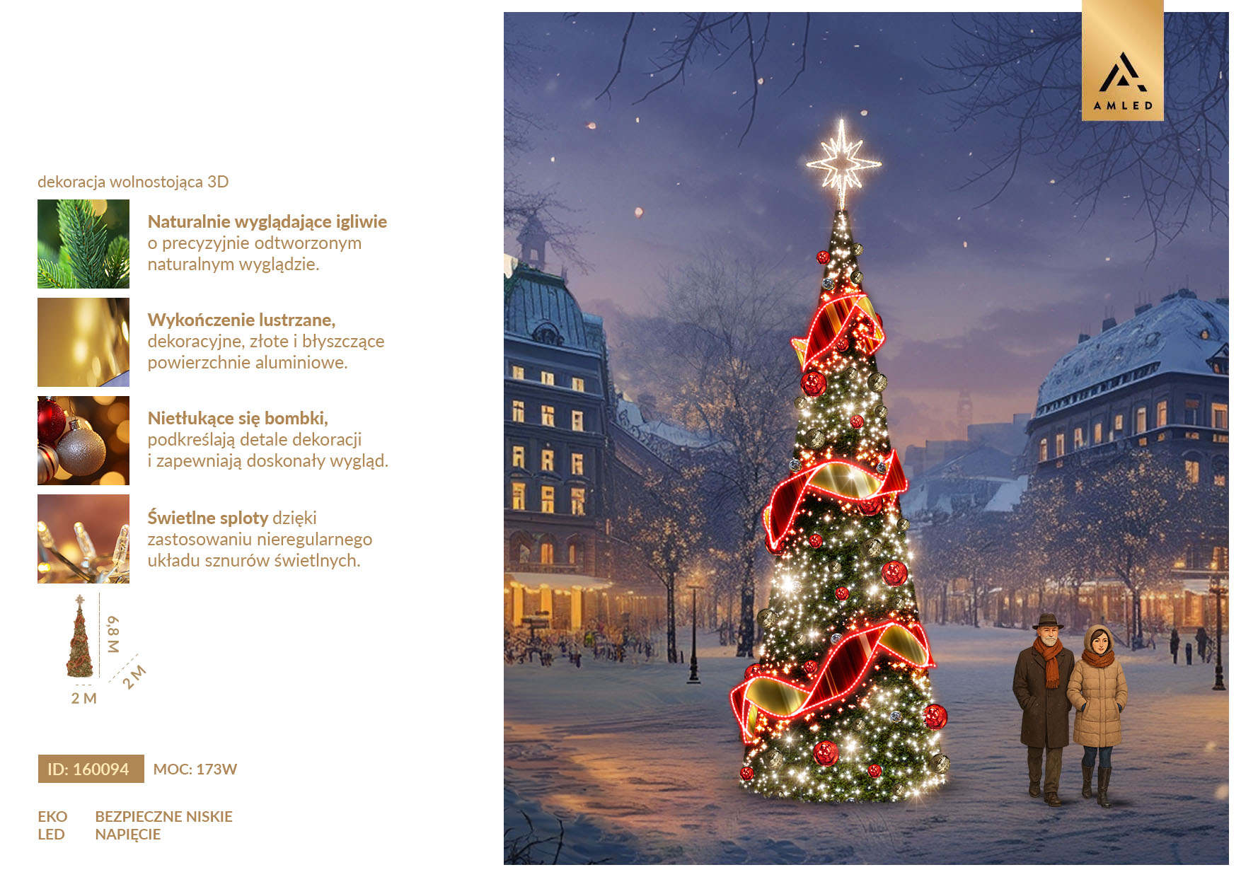 Stabilna i łatwa w montażu konstrukcja – choinka oparta jest na trwałym, stalowym stelażu lakierowanym proszkowo, odpornym na warunki atmosferyczne. Segmentowa budowa ułatwia transport i składanie, co sprawia, że dekoracja może być używana sezonowo przez wiele lat.