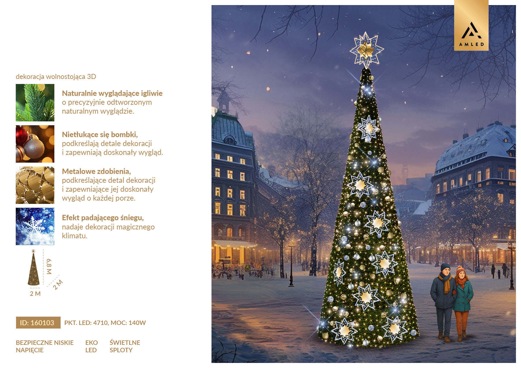 Choinka STOŻKOWA z GWIAZDAMI to elegancka dekoracja świąteczna o wysokości 6,8 metra, która przyciąga uwagę wyjątkowym układem przestrzennych gwiazd i klasycznym wykończeniem. Dekoracyjne gwiazdy LED rozmieszczone na gęstym igliwiu tworzą harmonijną i wyrazistą kompozycję.