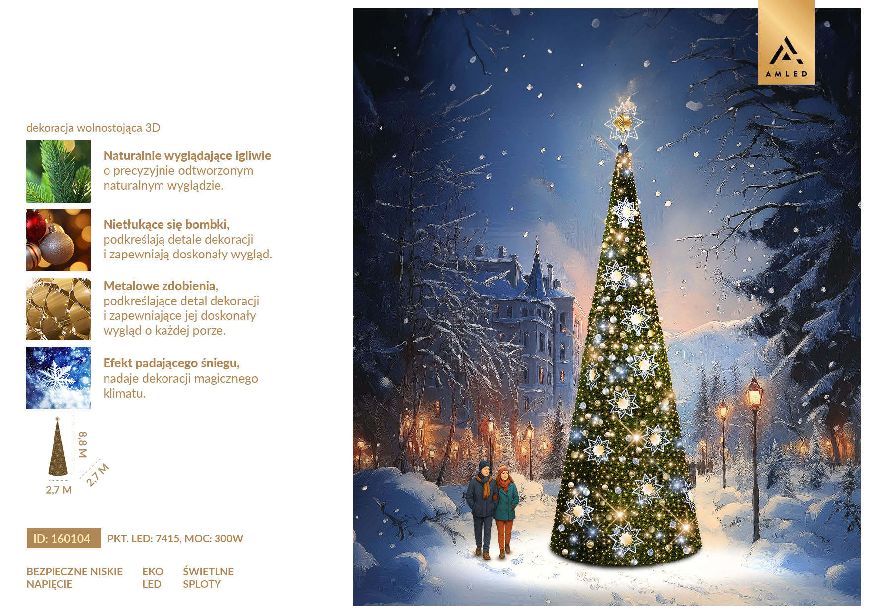 Choinka STOŻKOWA z GWIAZDAMI to elegancka dekoracja świąteczna o wysokości 8,8 metra, która przyciąga uwagę wyjątkowym układem przestrzennych gwiazd i klasycznym wykończeniem. Dekoracyjne gwiazdy LED rozmieszczone na gęstym igliwiu tworzą harmonijną i wyrazistą kompozycję.