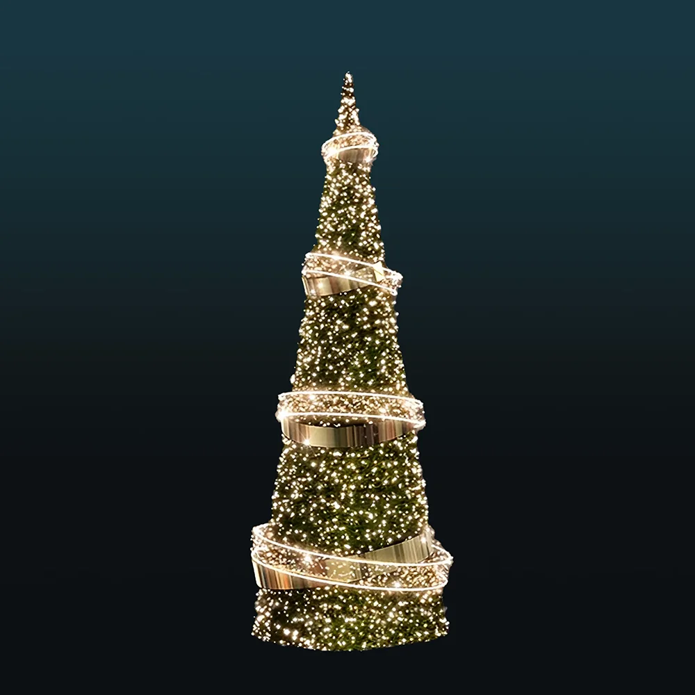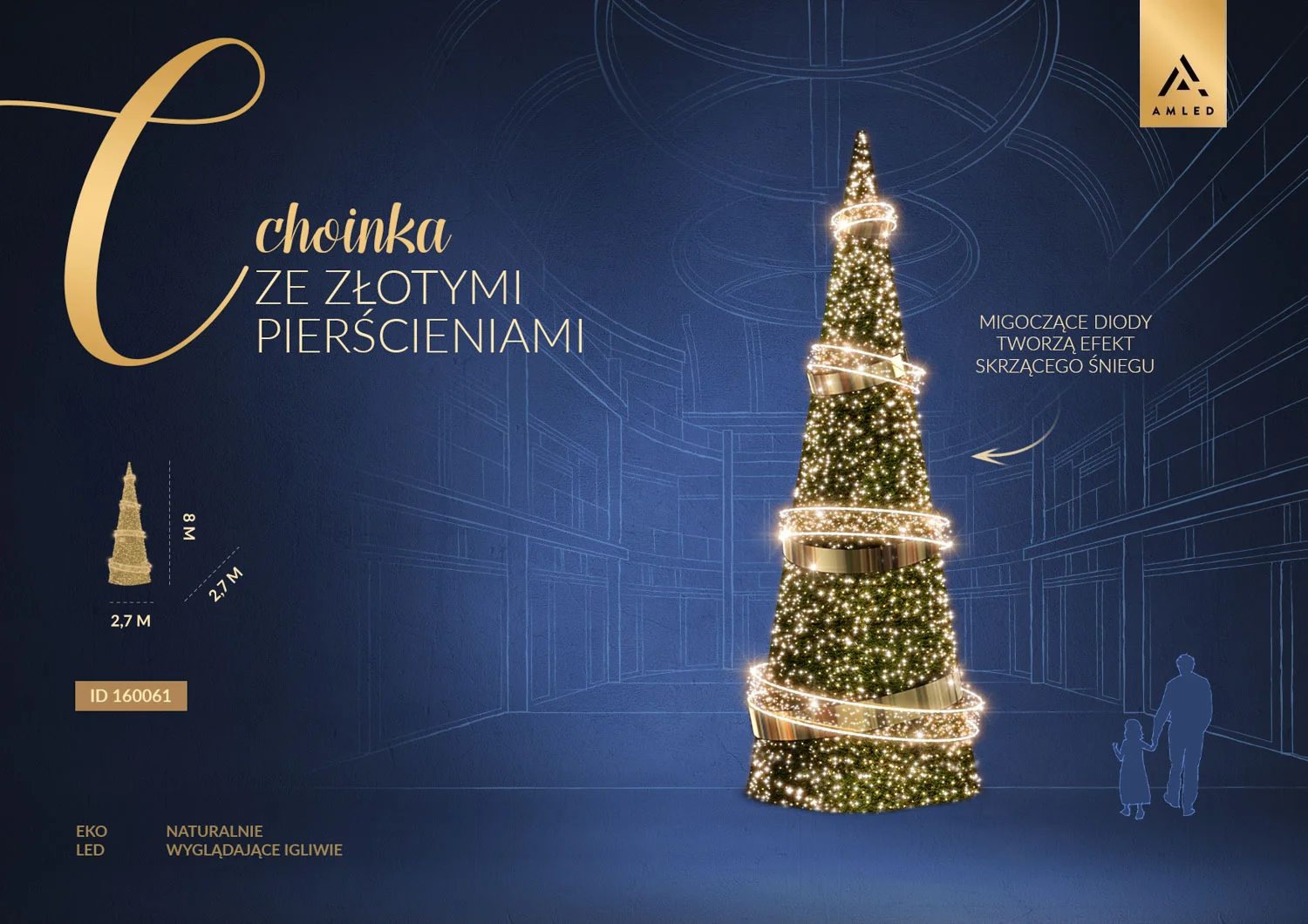 Choinka STOŻKOWA ZE ZŁOTYMI PIERŚCIENIAMI to elegancka dekoracja o wysokości 8 metrów, łącząca nowoczesny design z klasycznym świątecznym stylem. Subtelnie skrzące się światło LED w połączeniu z połyskującymi pierścieniami tworzy kompozycję, która przyciąga wzrok i nadaje przestrzeni luksusowy charakter.