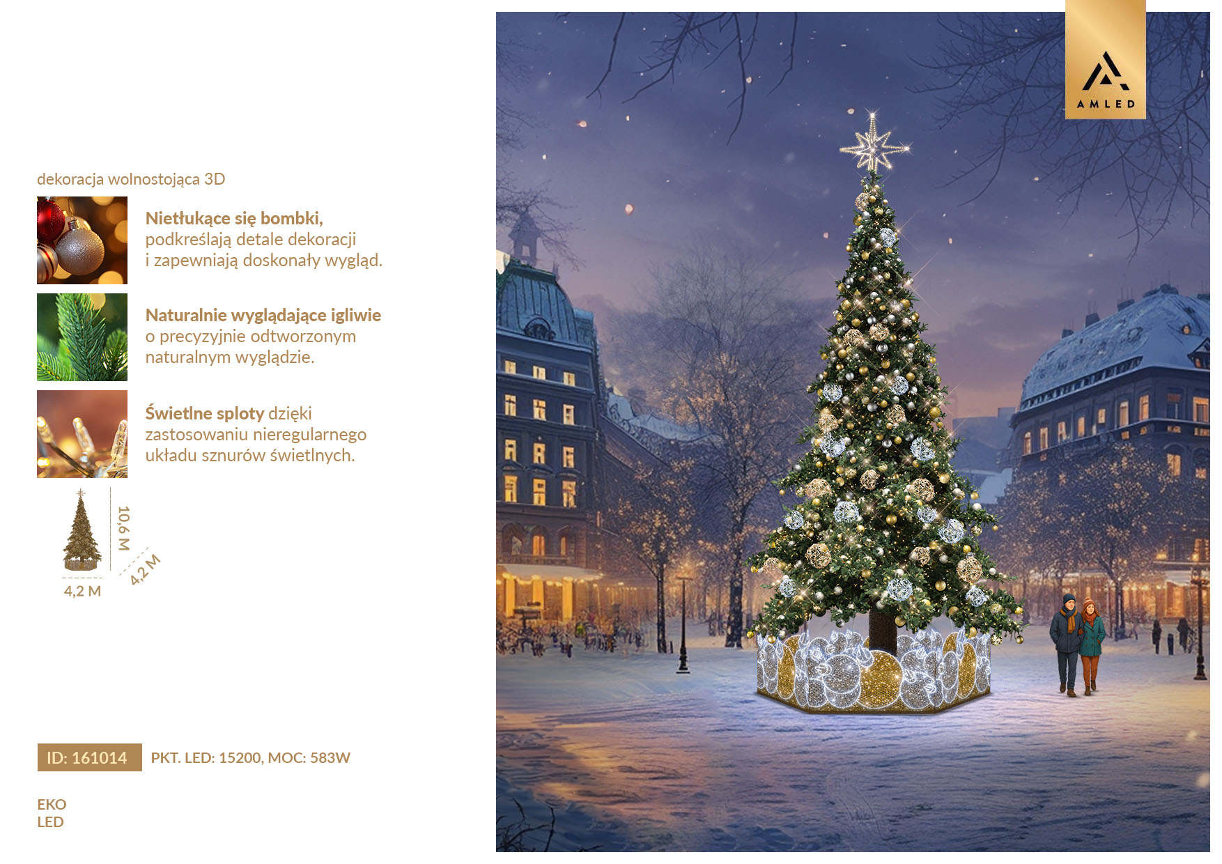 Jakość i bezpieczeństwo – konstrukcja wykonana z lakierowanego metalu zapewnia stabilność i odporność na warunki zewnętrzne. Choinka wyposażona jest w aż 15040 punktów LED o efekcie skrzącego śniegu, zasilanych bezpiecznym niskim napięciem. Dekoracyjna osłona podstawy, ozdobiona świetlnym motywem owoców i liści, dopełnia całość projektu.