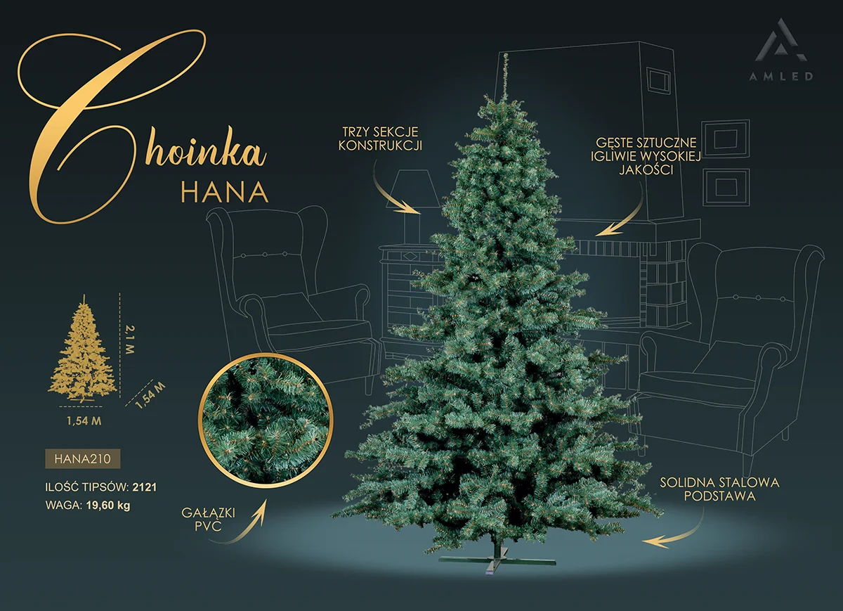 Grafika produktowa choinki HANA z opisem cech: trzysekcyjna konstrukcja, 2121 tipsów, igliwie PVC i stalowa podstawa.