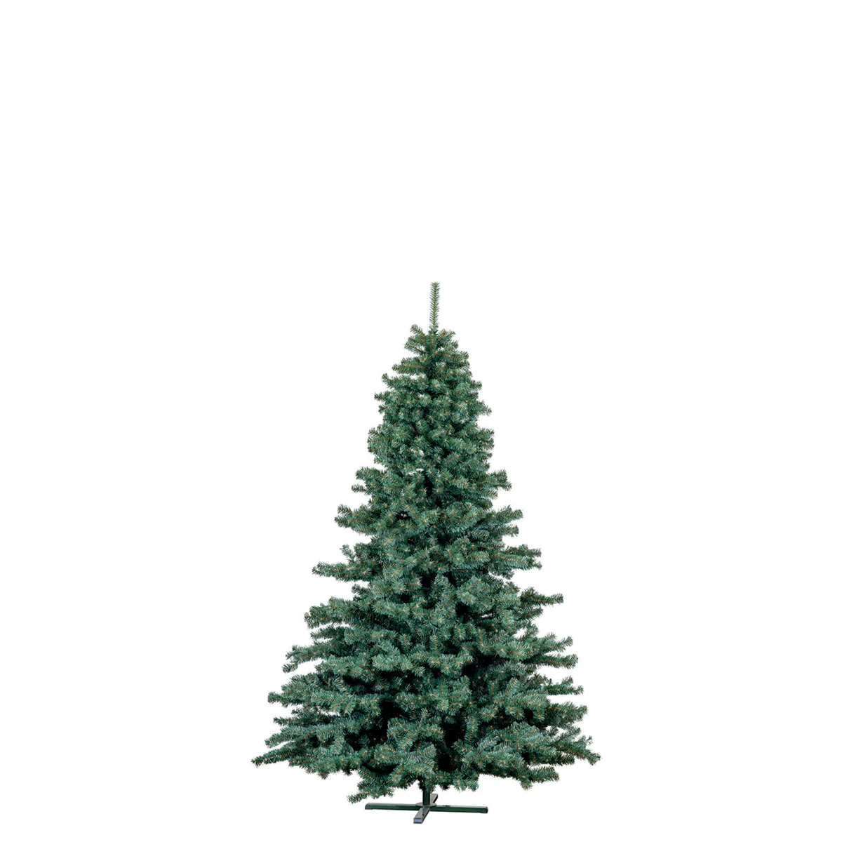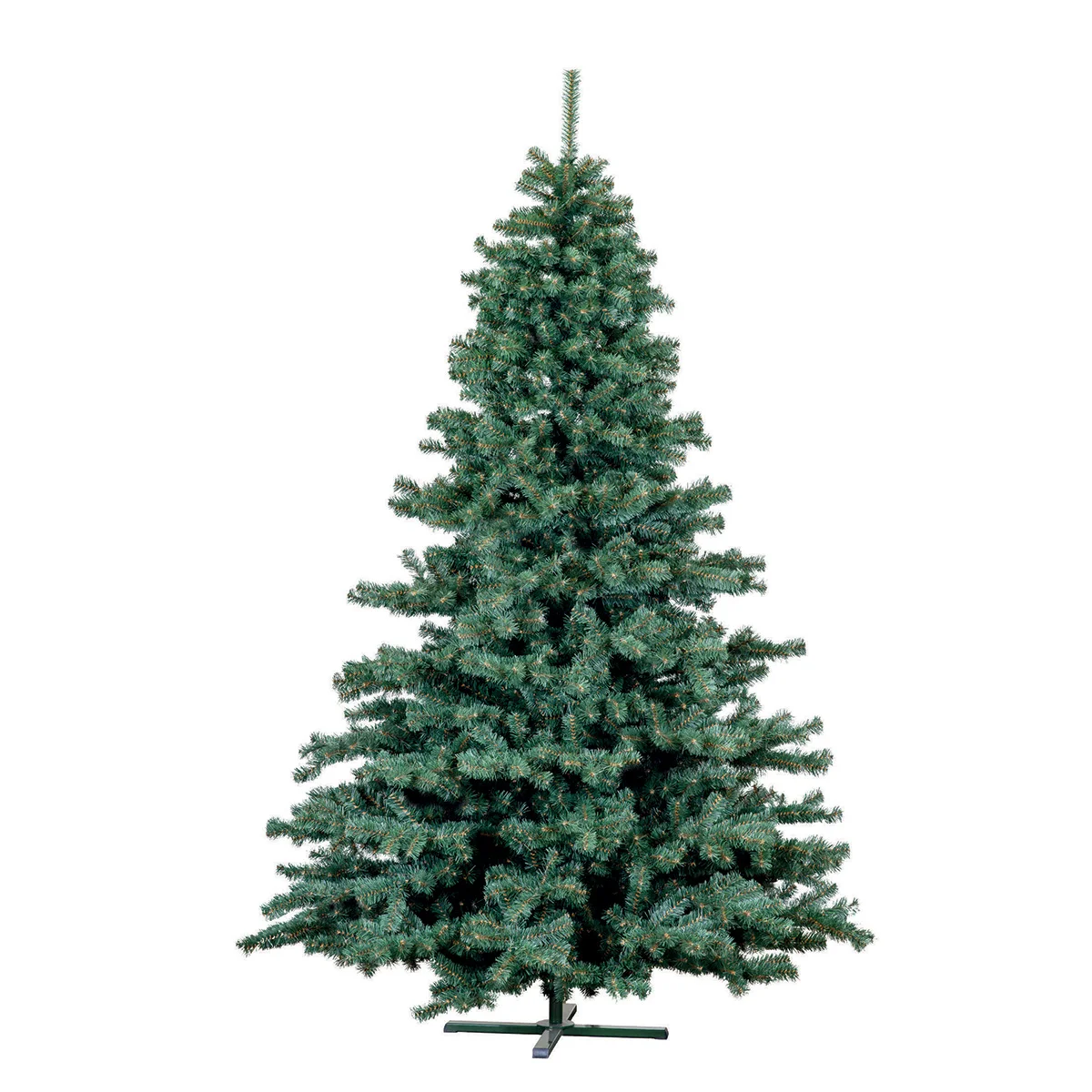 Zielona choinka HANA o wysokości 210 cm z gęstym igliwiem PVC, ustawiona na stalowym stojaku na białym tle.