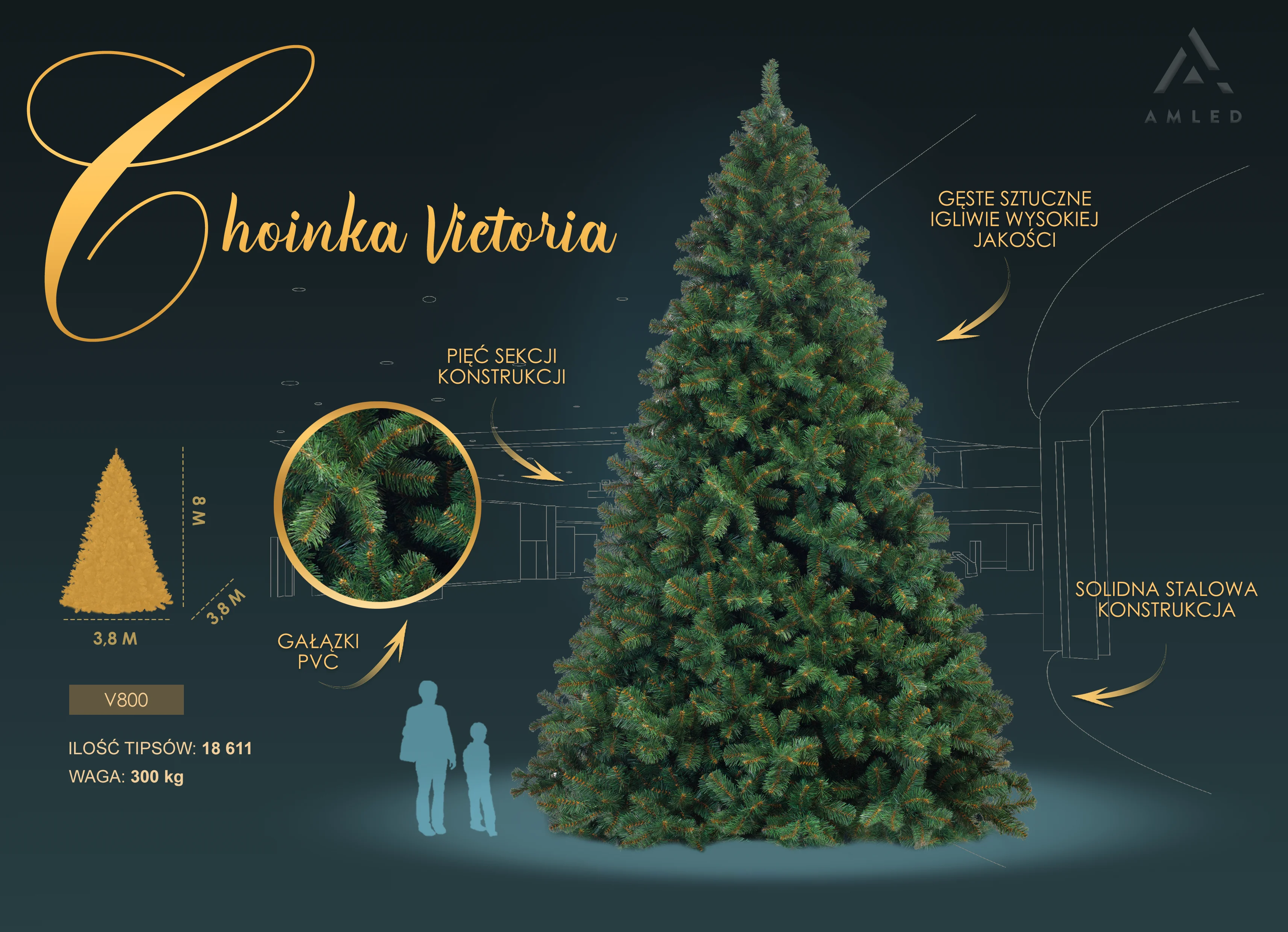Efektowna sylwetka i naturalny wygląd – Choinka Victoria V800 o wysokości 8 metrów i średnicy 3,8 m zachwyca swoją symetrią i okazałą formą. Dzięki aż 18 611 tipsom wykonanym z wysokogatunkowego PVC, igliwie prezentuje się wyjątkowo gęsto i realistycznie, doskonale imitując żywą sosnę.