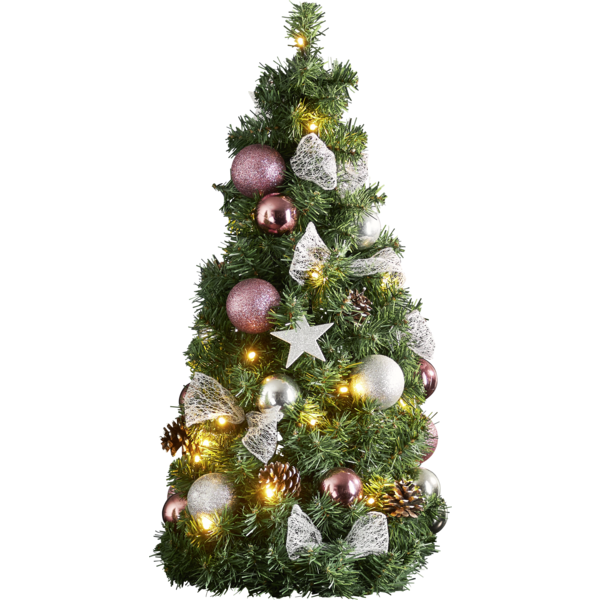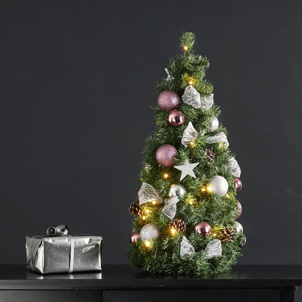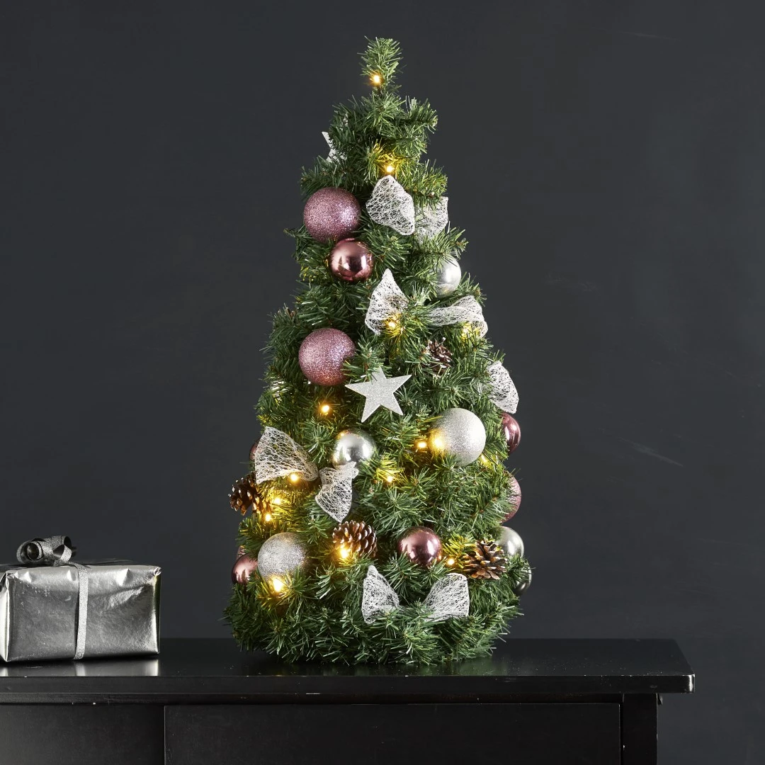 Sztuczna choinka udekorowana różowymi i srebrnymi bombkami, szyszkami, srebrnymi kokardkami i ciepłymi lampkami LED, na białym tle.