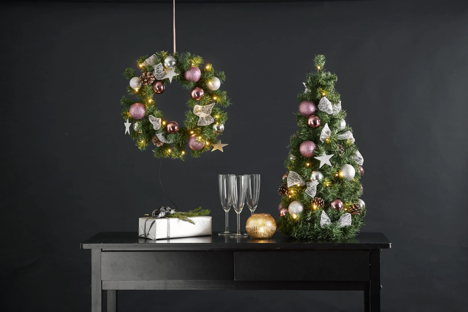 Choinka dekoracyjna ustawiona na czarnym stole na tle ciemnej ściany, ozdobiona bombkami, kokardkami i oświetleniem LED.