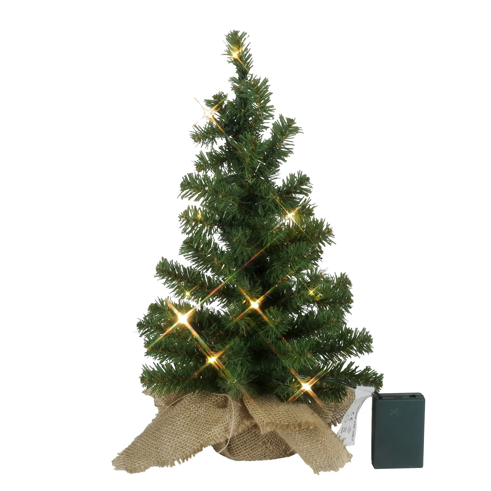 Mała choinka LED o wysokości 45 cm z zielonym igliwiem i świecącymi lampkami, ustawiona na białym tle, z widocznym pudełkiem na baterie.