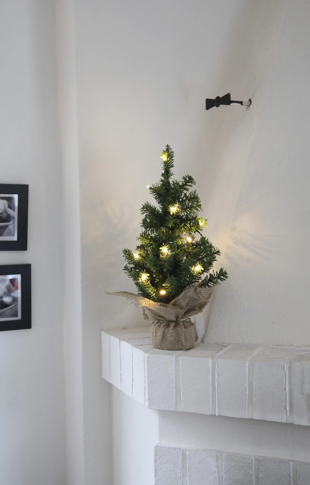 Choinka LED ustawiona na białym kominku, świecąca ciepłym światłem w jasnym wnętrzu.