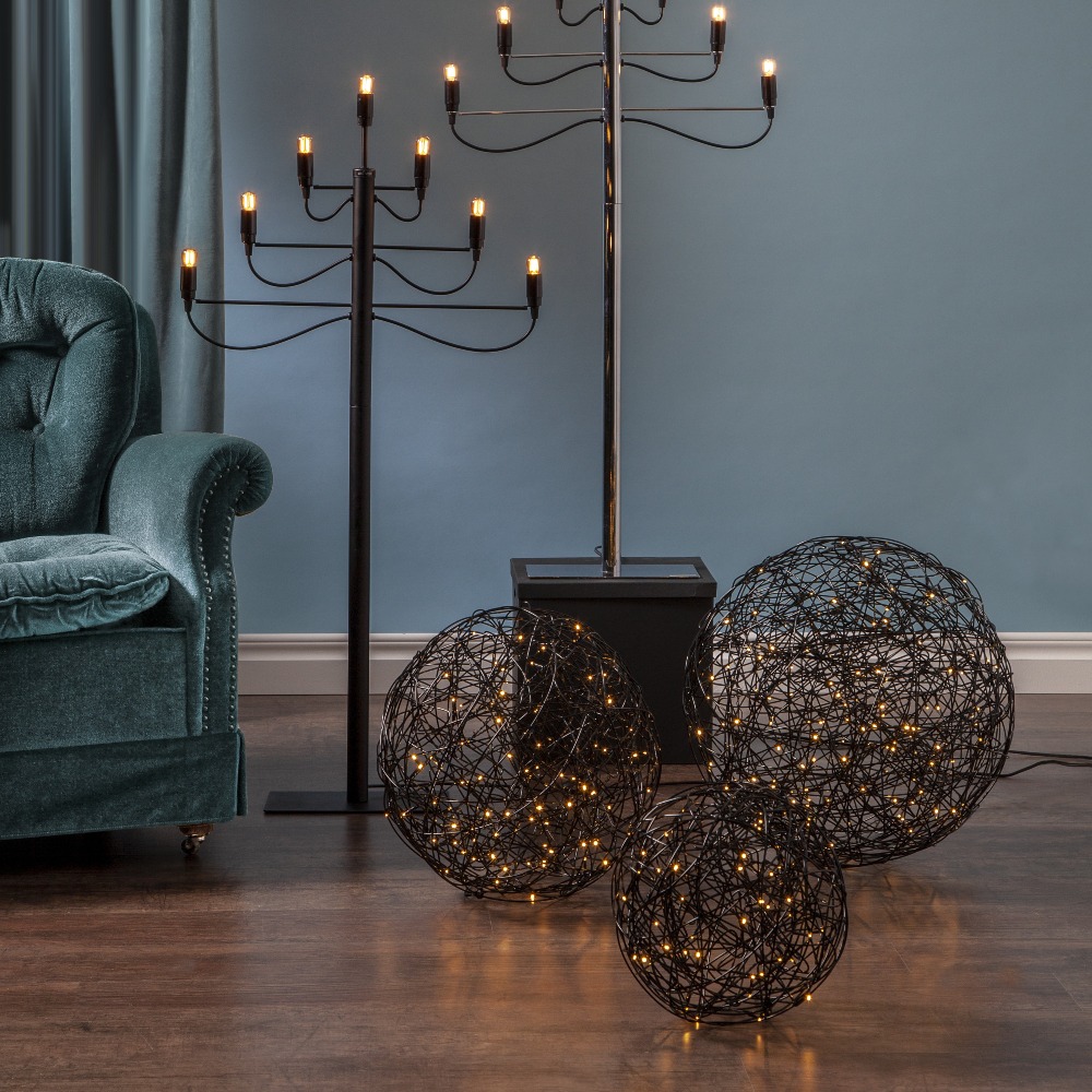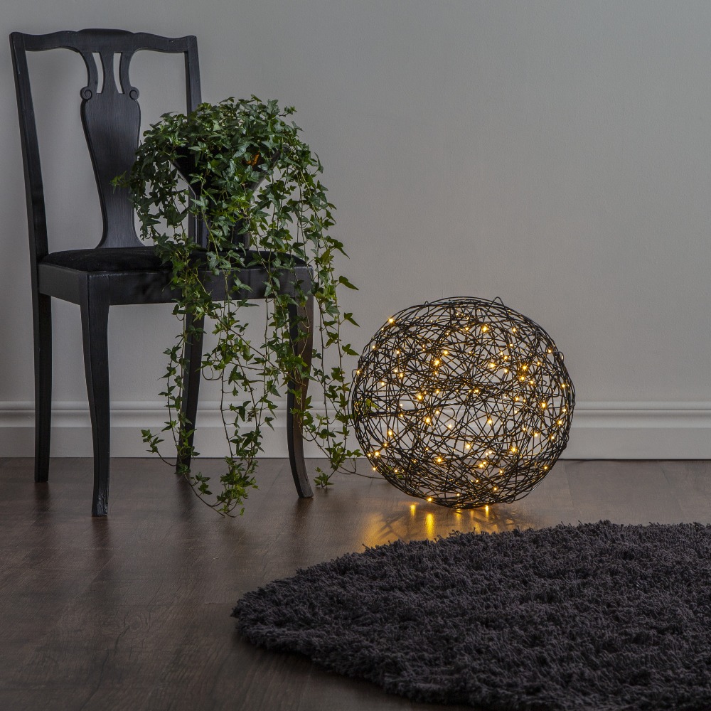 Czarna kula LED z metalowego drutu ustawiona na podłodze we wnętrzu, obok krzesła z rośliną i ciemnego dywanu. Ciepłe punkty światła widoczne w ażurowej formie tworzą nastrojową, domową aranżację.