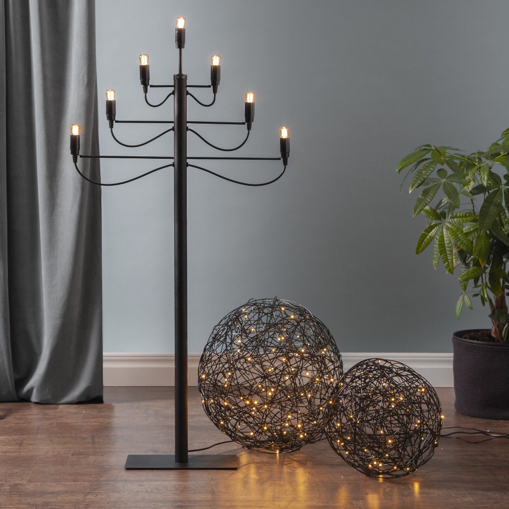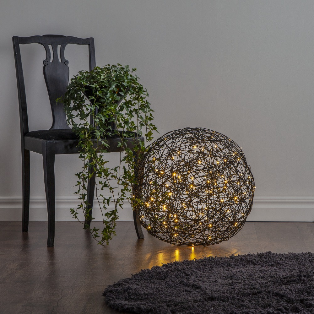 Czarna dekoracyjna kula LED z cienkiego drutu, stojąca na podłodze obok krzesła z przewieszającą się rośliną. Ciepłe punkty światła tworzą nastrojową atmosferę w minimalistycznym wnętrzu.