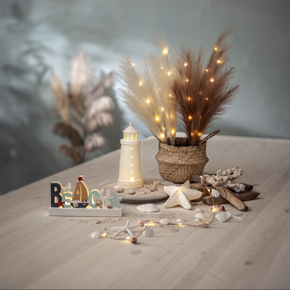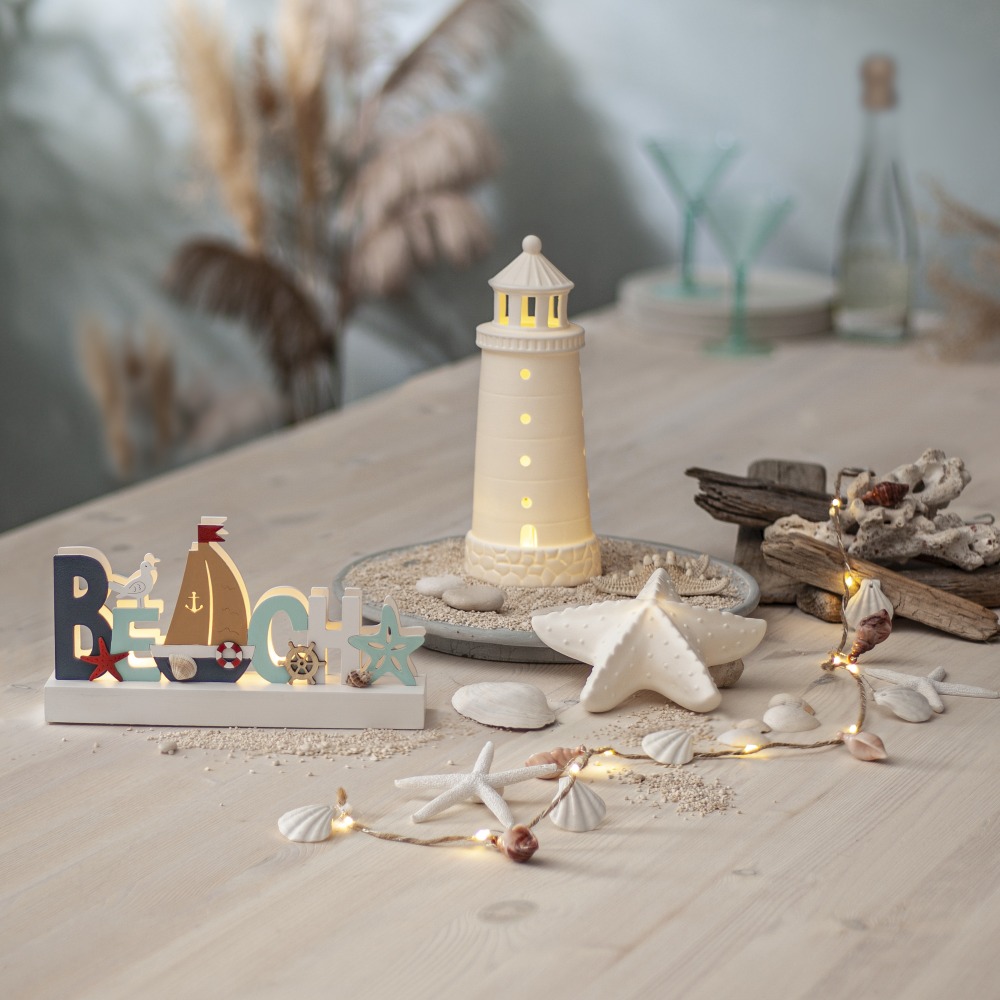Drewniana dekoracja Beach LED w aranżacji z porcelanową latarnią i rozgwiazdą wśród muszli i dekoracji w stylu seaside.