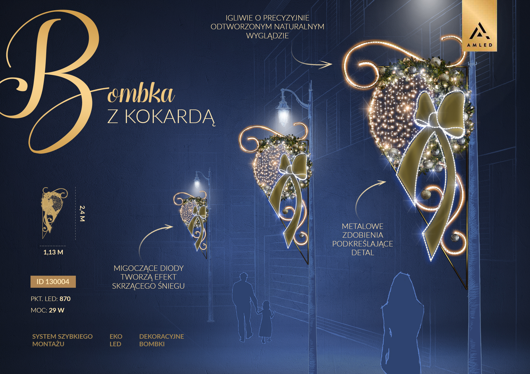 Ta wyjątkowa dekoracja latarniowa w kształcie bombki z ozdobną kokardą to propozycja dla przestrzeni miejskich, które chcą wyróżnić się efektowną, ale elegancką iluminacją świąteczną. Realistyczne detale, połyskliwe zdobienia i precyzyjne światło LED tworzą zachwycający efekt zarówno z bliska, jak i z większej odległości. Doskonale prezentuje się w ciągach ulicznych, przy deptakach i wejściach do galerii.