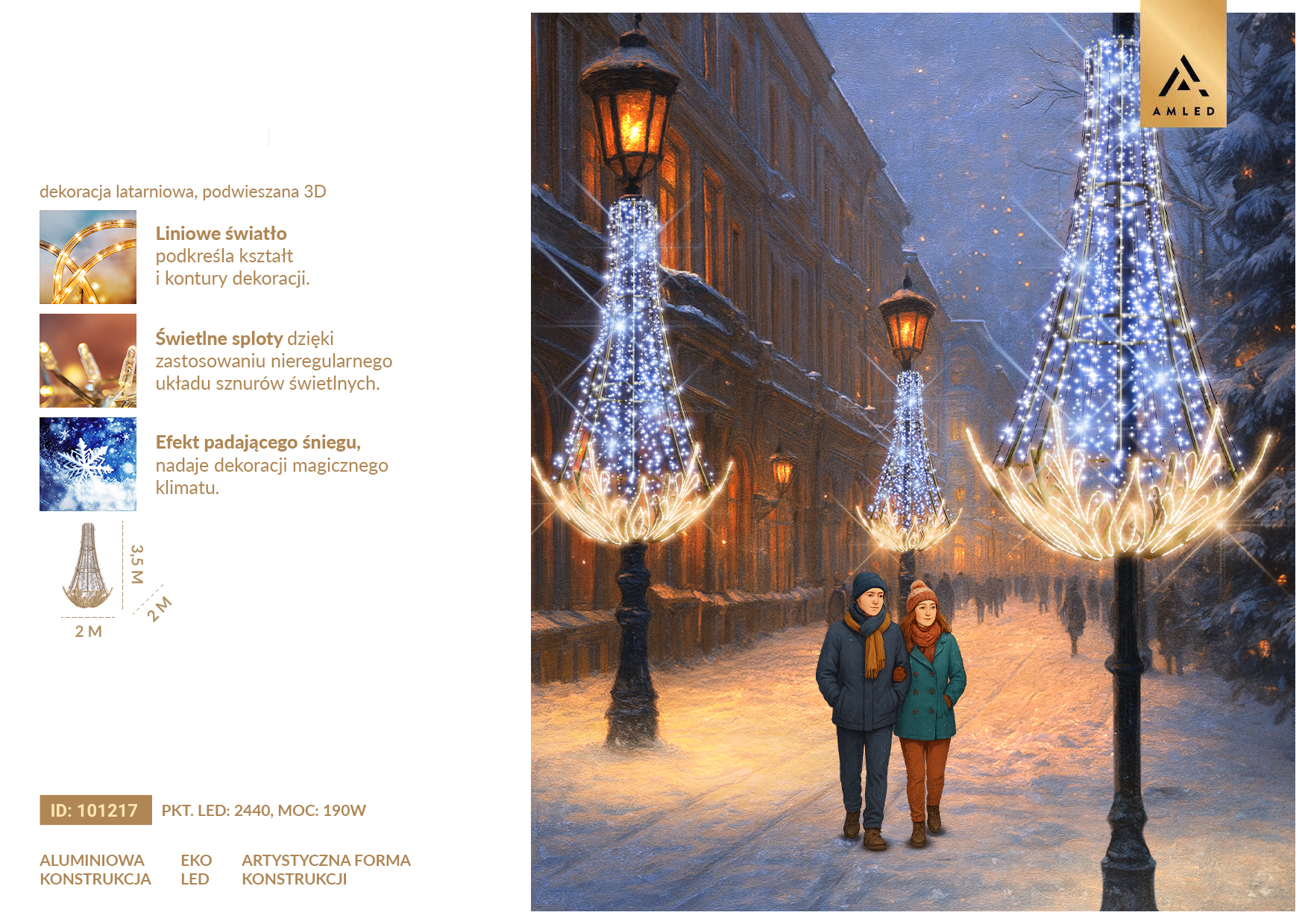 Artystyczna forma świetlna – zwężająca się ku górze konstrukcja zakończona misternymi ornamentami świetlnymi u dołu tworzy efekt rozkwitającej śnieżynki, nadając ulicom i placom wyjątkowego klimatu.