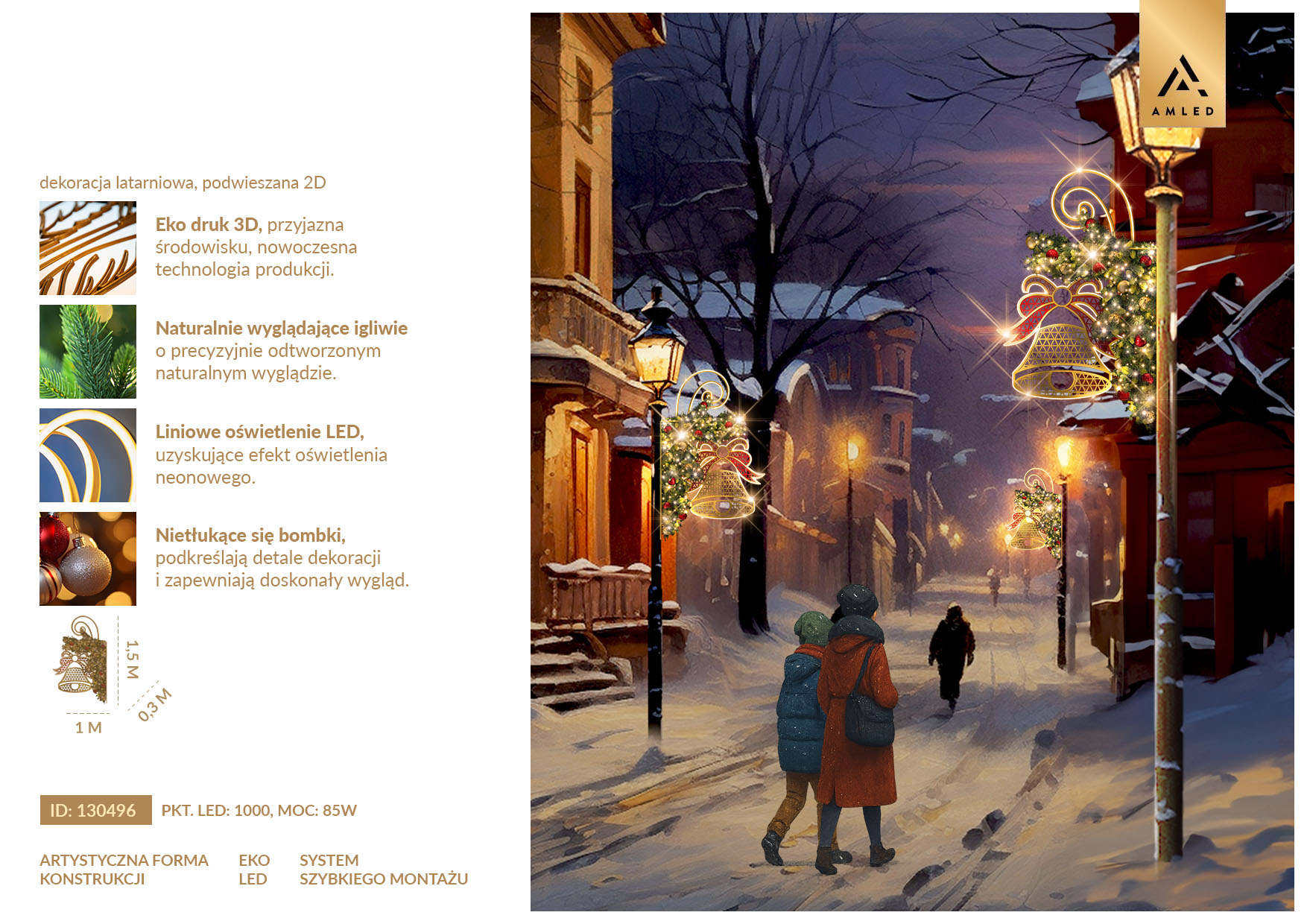 Dzwonek z Zielonym Iglakiem 2D LED to elegancka dekoracja latarniowa, łącząca klasyczne świąteczne motywy z nowoczesną formą wykonania. Jej złote kontury, błyszczące bombki i realistyczne igliwie tworzą wspaniałą kompozycję świetlną, która wprowadza ciepło i blask do miejskich ulic w okresie zimowych świąt.