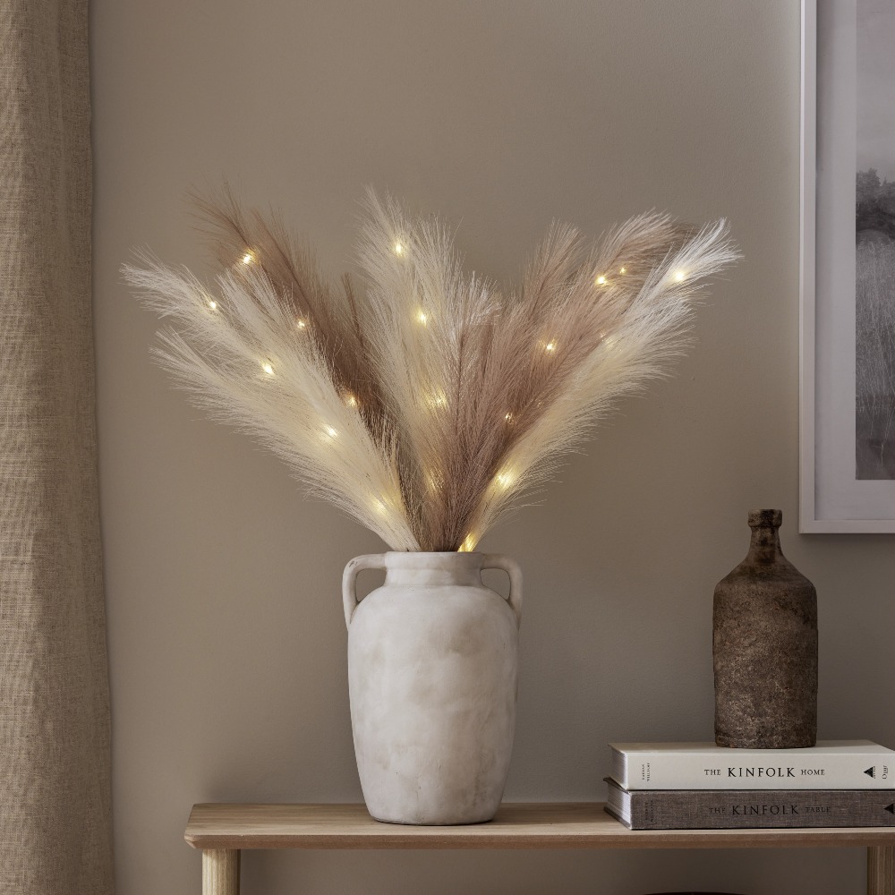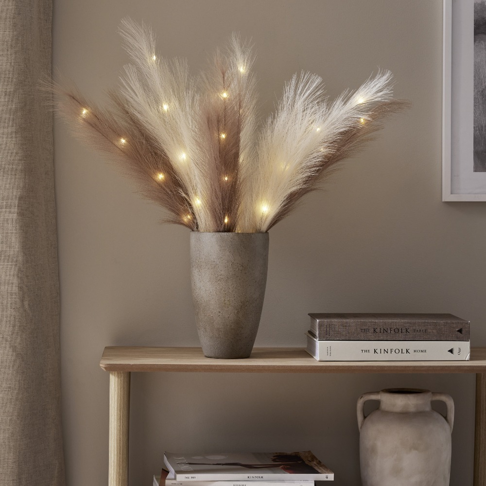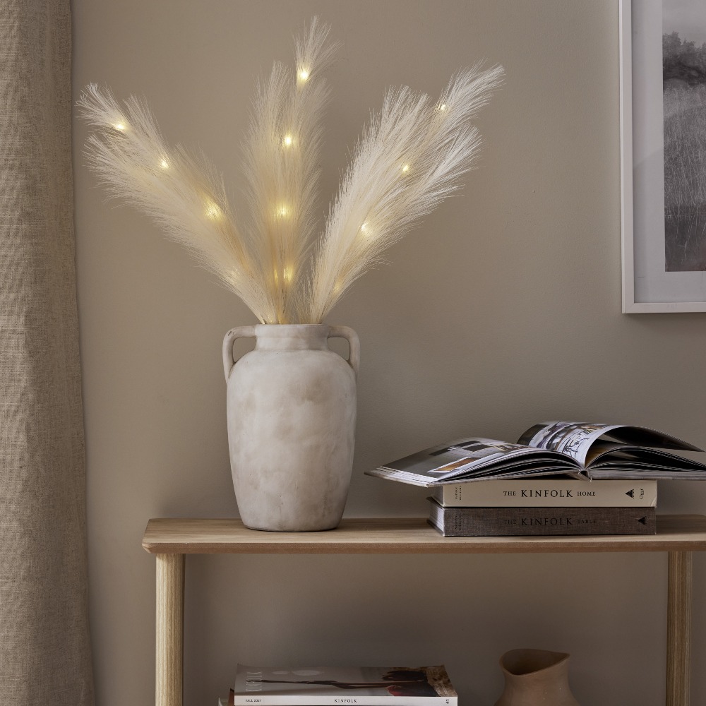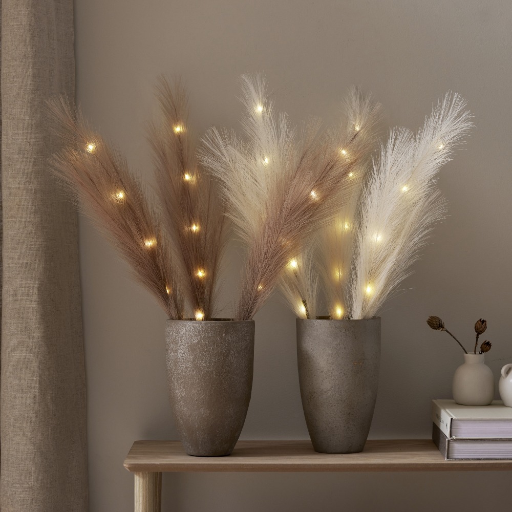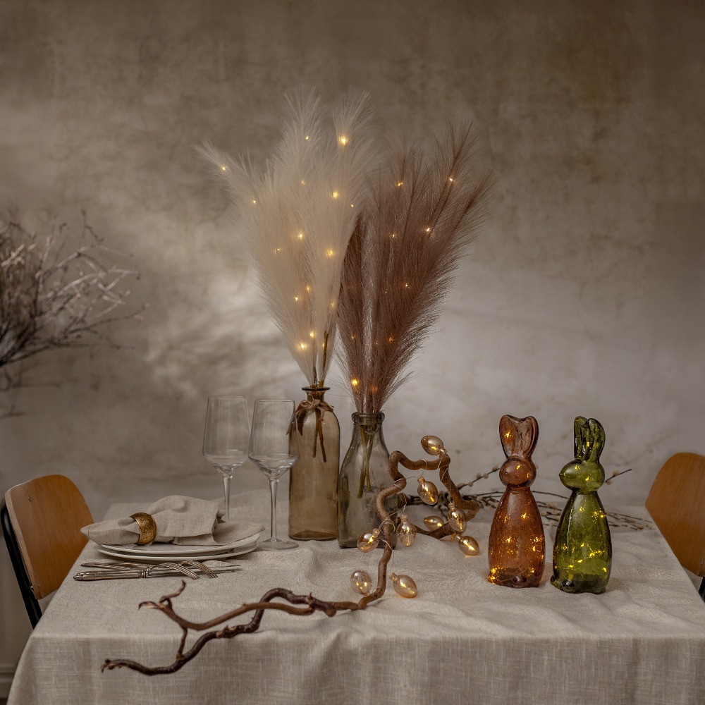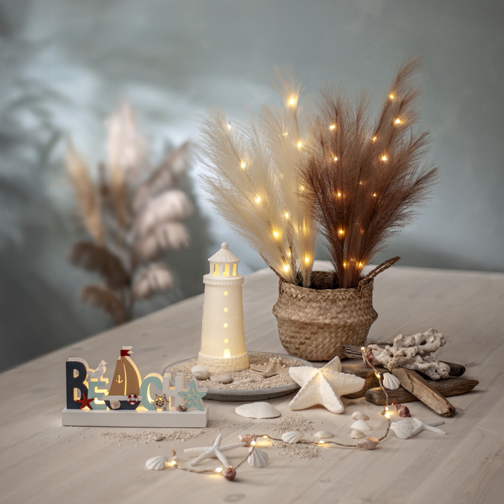 Dekoracyjna ozdoba z dużymi, sztucznymi piórami w kolorze ecru to wyjątkowy dodatek, który wprowadzi do wnętrza lekkość i przytulny nastrój. Subtelna forma oraz elegancka, jasna kolorystyka sprawiają, że dekoracja doskonale komponuje się z różnymi aranżacjami – od naturalnych po nowoczesne. Wbudowane diody LED emitują ciepłe, przyjemne światło, tworząc nastrojowy efekt dekoracyjny. To prosty sposób na stworzenie klimatycznej dekoracji w salonie, sypialni lub na komodzie.