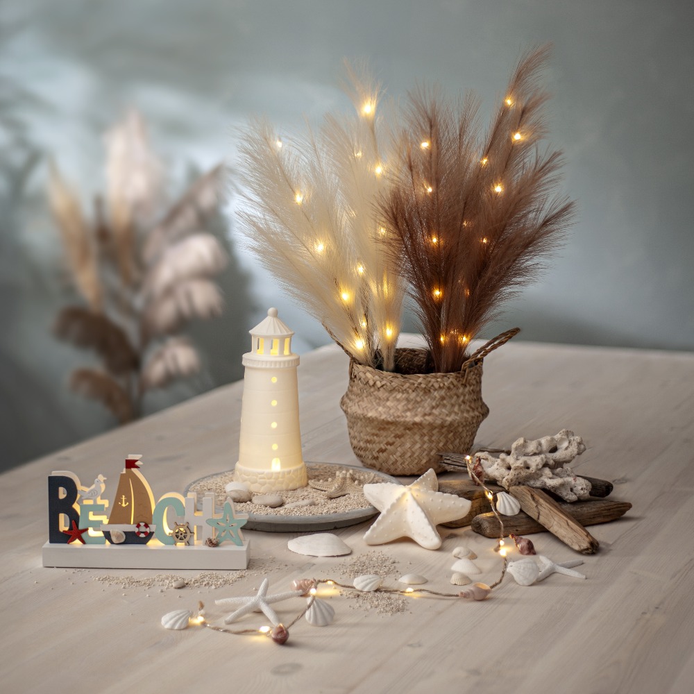 Dekoracyjna rozgwiazda wykonana z matowej, białej porcelany to subtelny dodatek inspirowany nadmorskim stylem. Jej prosta forma i jasna kolorystyka sprawiają, że stanowi elegancki akcent na półce, komodzie lub stole. Wbudowane oświetlenie tworzy przyjemny klimat i podkreśla dekoracyjny charakter produktu.