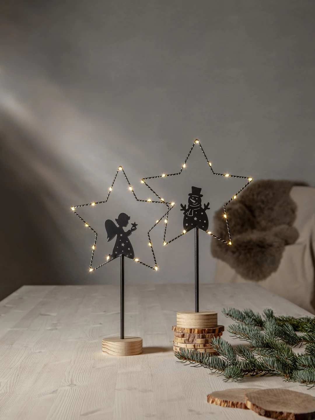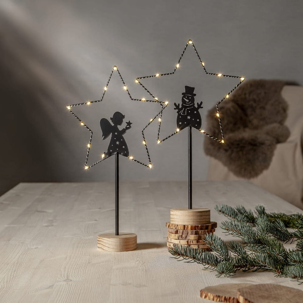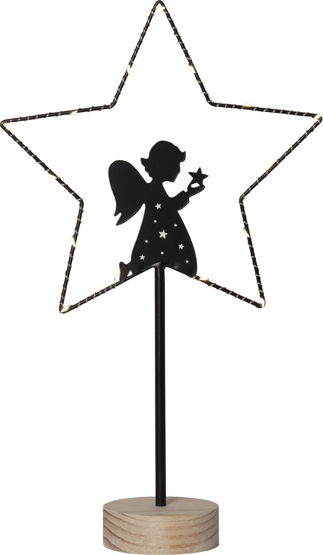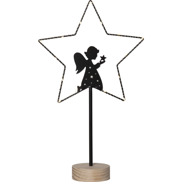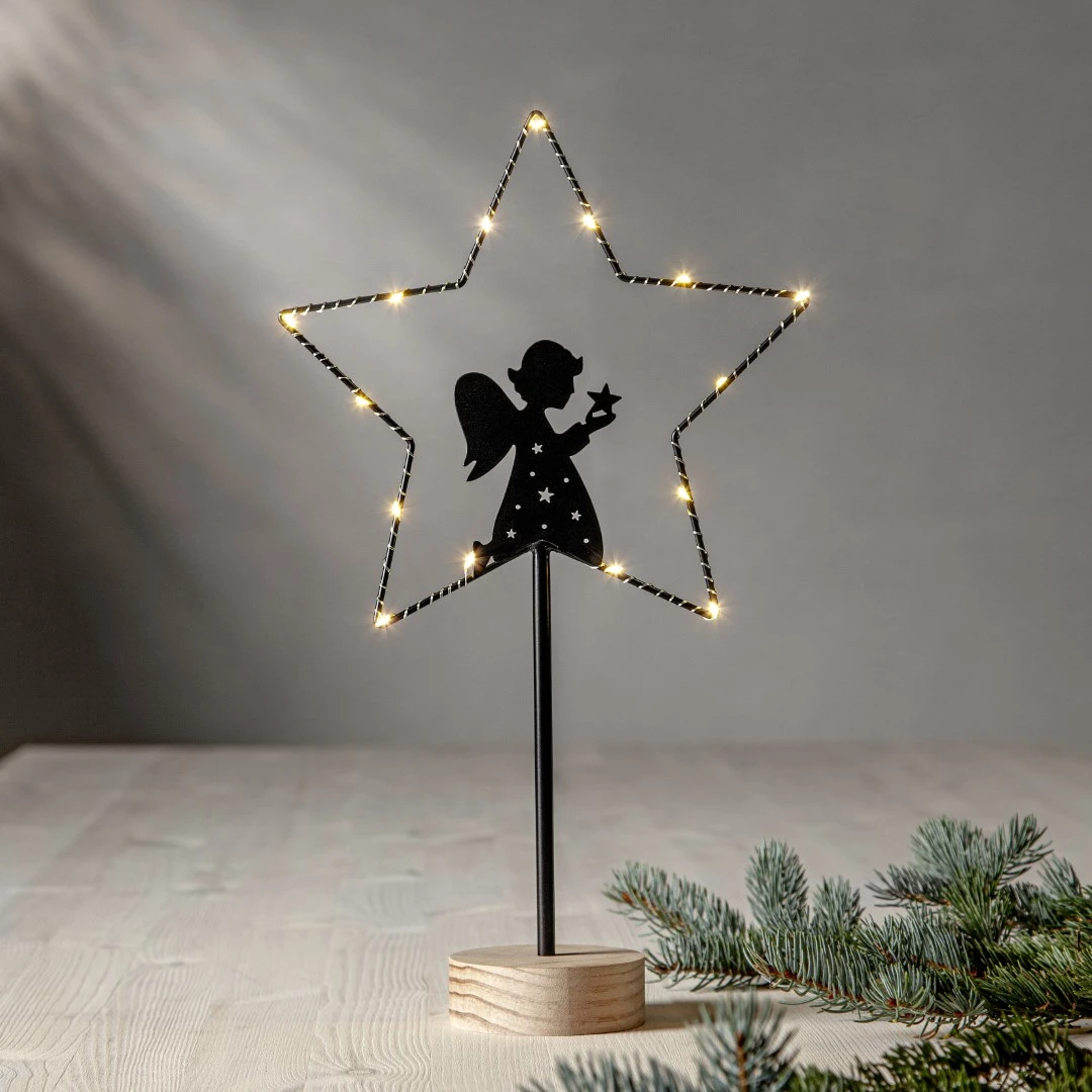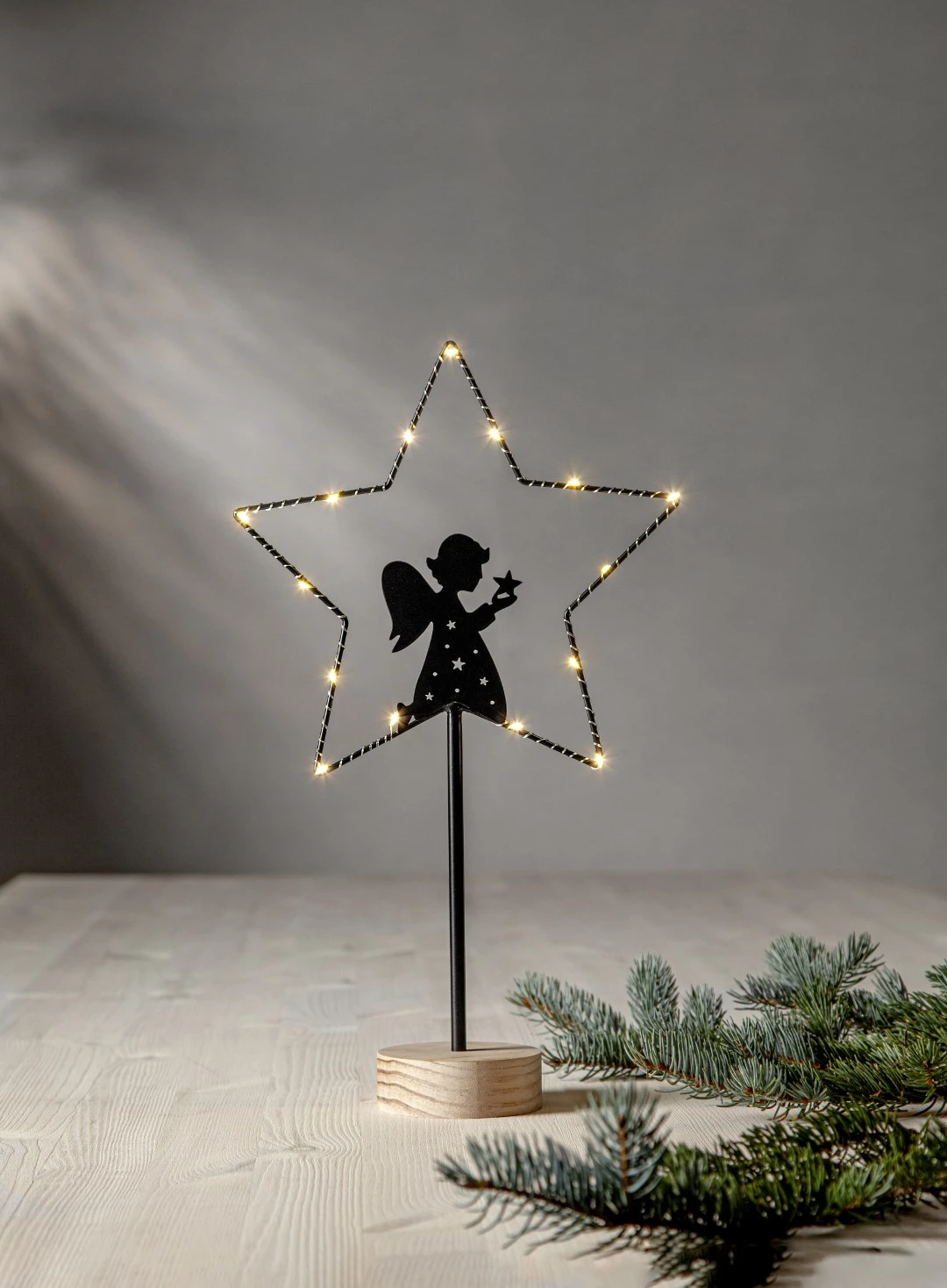 Czarna gwiazda o średnicy 25 cm i wysokości 42 cm to subtelna dekoracja świetlna, która wprowadza do wnętrza magiczny i przytulny nastrój. W jej wnętrzu znajduje się sylwetka anioła trzymającego gwiazdkę, a całość rozświetlona jest delikatnym łańcuchem LED typu Dew Drop. Umieszczona na drewnianej podstawie, łączy naturalność z elegancją i doskonale sprawdzi się w bożonarodzeniowej aranżacji lub jako symboliczny akcent przez cały rok.