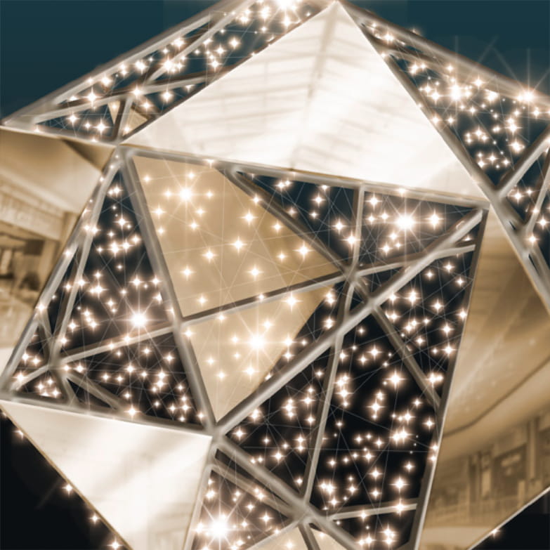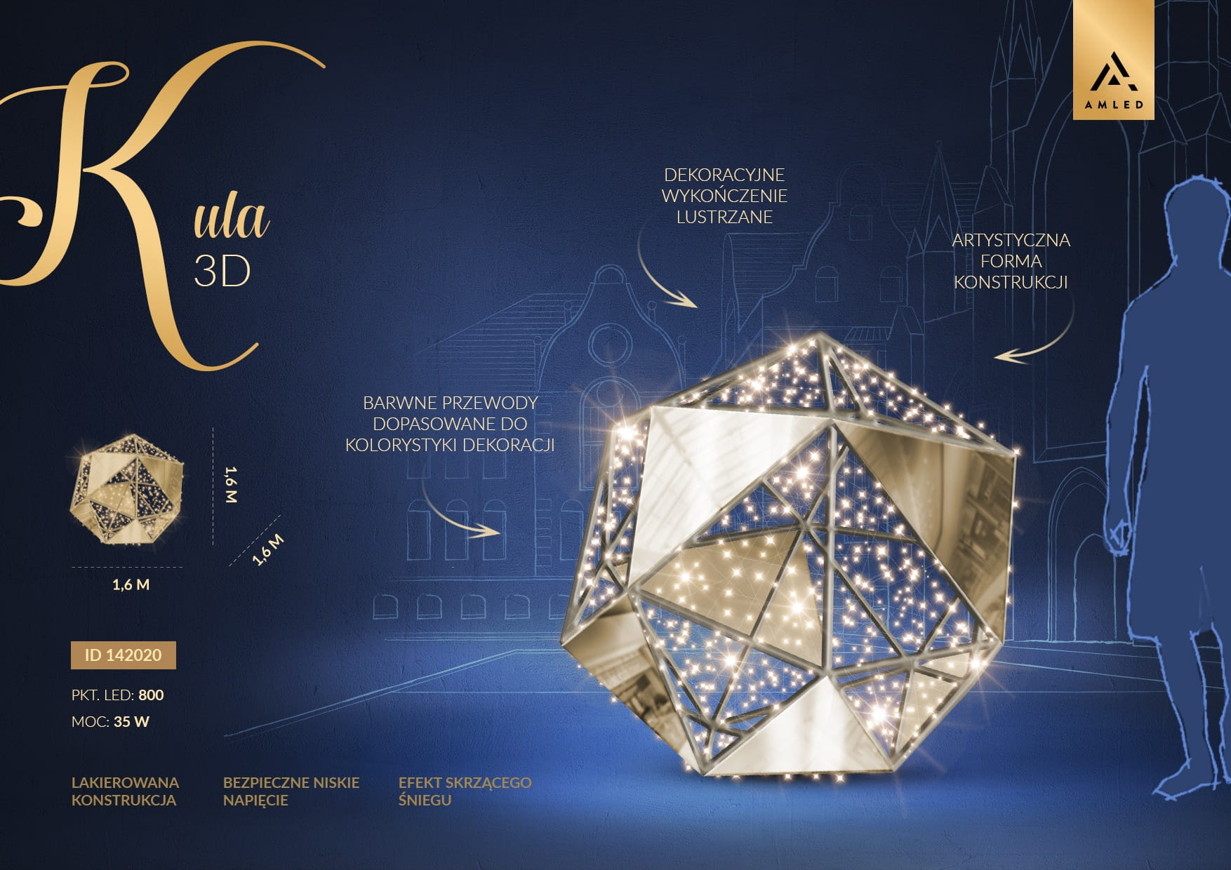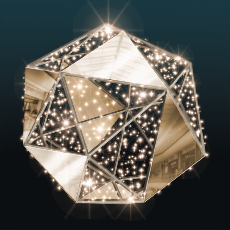 Ta efektowna kula o średnicy 1,6 m to dekoracja, która przyciąga wzrok swoją wyjątkową formą i lustrzanym wykończeniem. Idealna zarówno jako samodzielny element ozdobny, jak i część większej kompozycji świetlnej. Jej lśniąca, wielościenna konstrukcja odbija światło i otoczenie, tworząc niepowtarzalną atmosferę – zwłaszcza wieczorami.