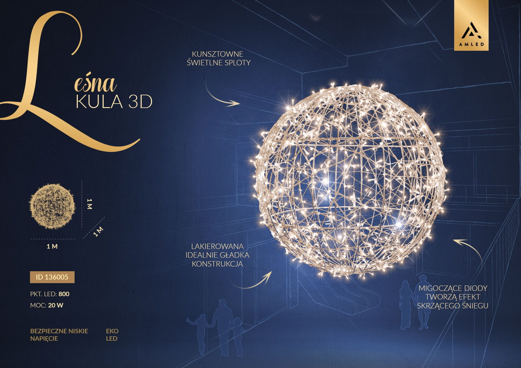 Grafika informacyjna prezentująca Leśną Kulę 3D 1 m z liczbą punktów LED, mocą i efektami świetlnymi. Dekoracja sezonowa do aranżacji miejskich.