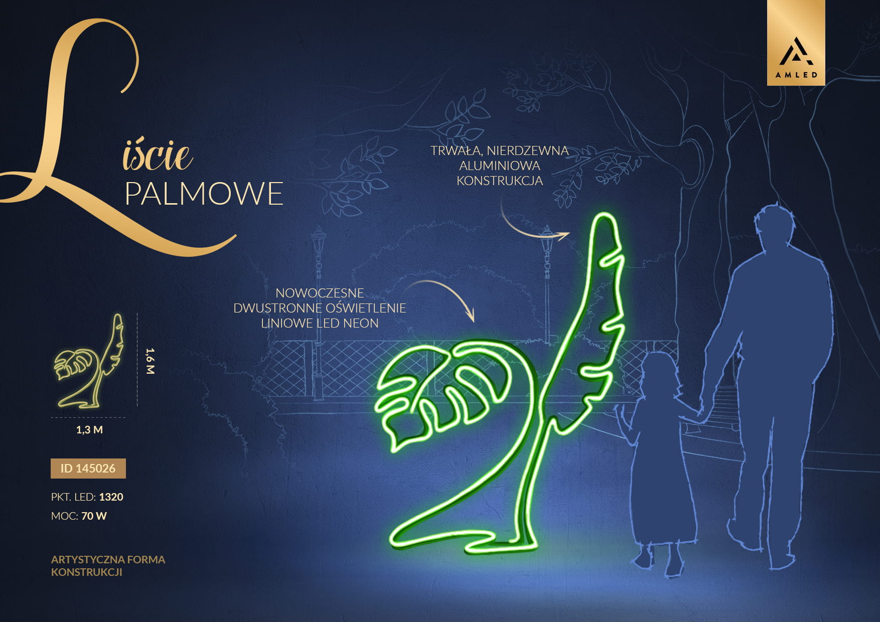 Liście Palmowe 2D to nowoczesna dekoracja świetlna inspirowana egzotyczną roślinnością, zaprojektowana z myślą o przestrzeniach miejskich i parkowych. Minimalistyczna, a jednocześnie wyrazista forma podkreślona liniowym światłem LED tworzy elegancki, lekki wizualnie akcent, który doskonale komponuje się z naturalnym otoczeniem.