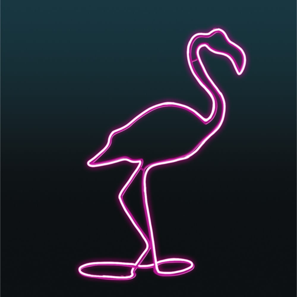 Dekoracja świetlna LED w formie flaminga na ciemnym tle, minimalistyczny fotopunkt z liniowym konturem LED neon, przeznaczony do parków, przestrzeni miejskich i instalacji plenerowych.