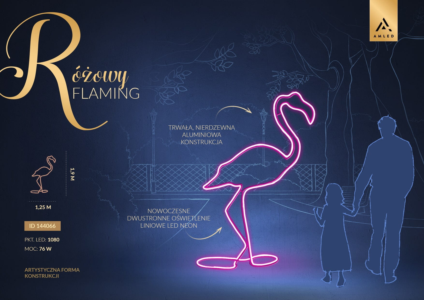 Różowy Flaming 2D to nowoczesna dekoracja świetlna, która przyciąga wzrok minimalistyczną formą i intensywnym, neonowym światłem. Inspirowany egzotycznym motywem, stanowi efektowny akcent w przestrzeni miejskiej, parkowej lub eventowej, tworząc wyrazisty i modny punkt aranżacyjny.