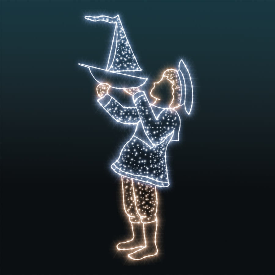 Chłopiec z Łódką 2D to niezwykle poetycka iluminacja, która przenosi odbiorcę w świat dziecięcych marzeń i zimowej magii. Sylwetka chłopca wznoszącego ku górze świetlną łódkę symbolizuje nadzieję, radość i beztroskę, a setki migoczących punktów LED tworzą wrażenie, jakby mały marzyciel wypuszczał w dal własne sny i opowieści. To dekoracja, która nadaje wyjątkowego uroku zarówno miejskim placom, jak i parkowym alejkom, stając się artystycznym akcentem w świątecznej scenerii.