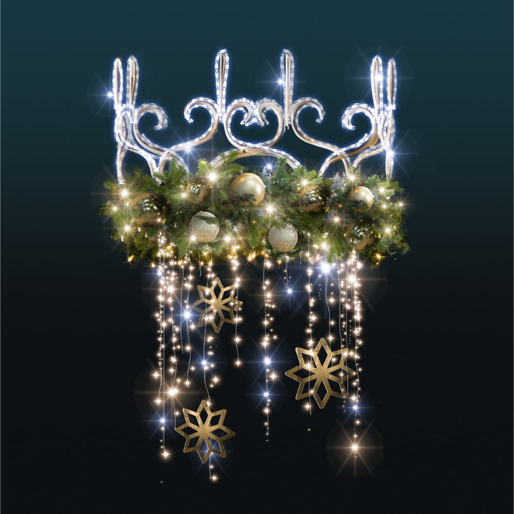 Dekoracja latarniowa 3D w formie korony z girlandą to efektowne rozwiązanie do iluminacji miejskiej, które łączy elegancję klasycznych zdobień z magią świątecznych świateł. Bogata girlanda z zielonych gałązek, ozdobiona złotymi i srebrnymi bombkami, w połączeniu z migoczącymi punktami LED tworzy atmosferę blasku i luksusu. To idealna propozycja do zdobienia ulic, placów i deptaków, gdzie podkreśla wyjątkowy charakter przestrzeni.
