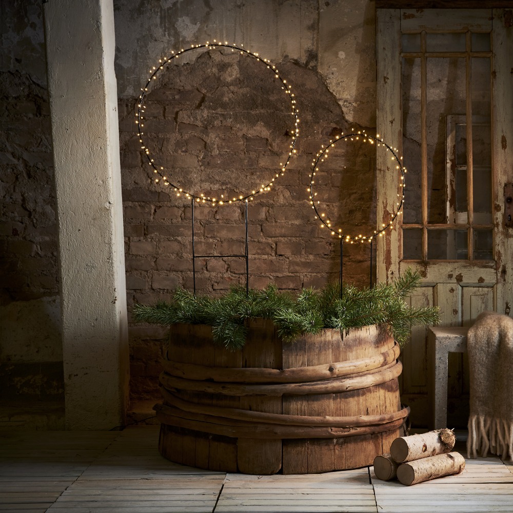 Okrągła dekoracja LED na metalowym stelażu, ustawiona w drewnianej beczce z gałązkami. Ciepłe światło lampek tworzy nastrojową aranżację w rustykalnym wnętrzu z ceglaną ścianą i drewnianymi drzwiami.