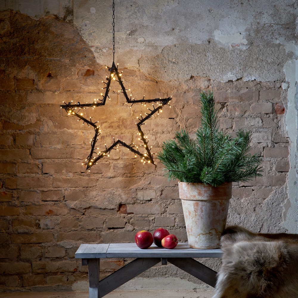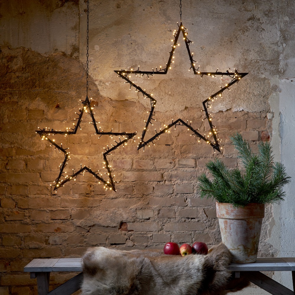 Dwie wiszące gwiazdy LED o różnych rozmiarach z ciepłymi punktami świetlnymi; zawieszone na łańcuchach na tle ceglanej ściany, dekoracyjna aranżacja z donicą i naturalnymi dodatkami.