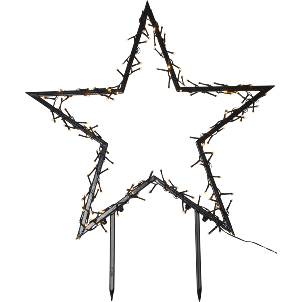 Gwiazda LED na metalowej ramie z małymi punktami świetlnymi, przeznaczona do wbicia w ziemię; białe tło, widoczne dwa metalowe pręty i przewód zasilający.