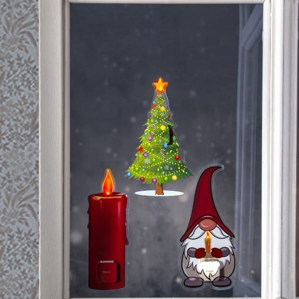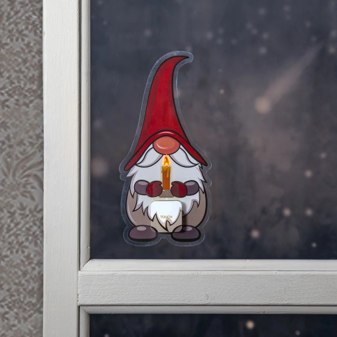 Świąteczna naklejka LED przedstawiająca skrzata w czerwonej czapce trzymającego zapaloną świecę, umieszczona na szybie okna z zimowym, ciemnym tłem.