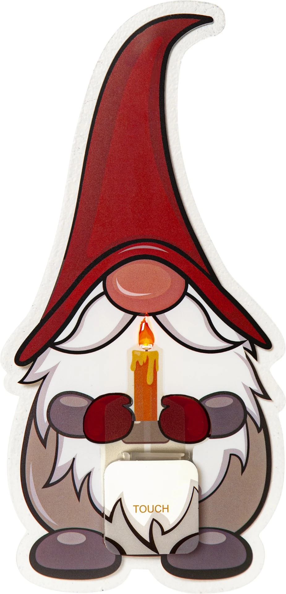 Naklejka LED w kształcie skrzata z czerwoną czapką i świecą w dłoniach, pokazana na białym tle w zbliżeniu z widocznym dotykowym włącznikiem.