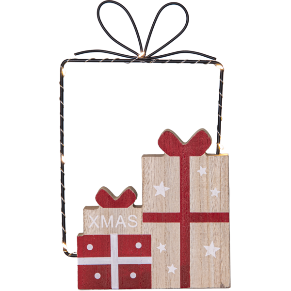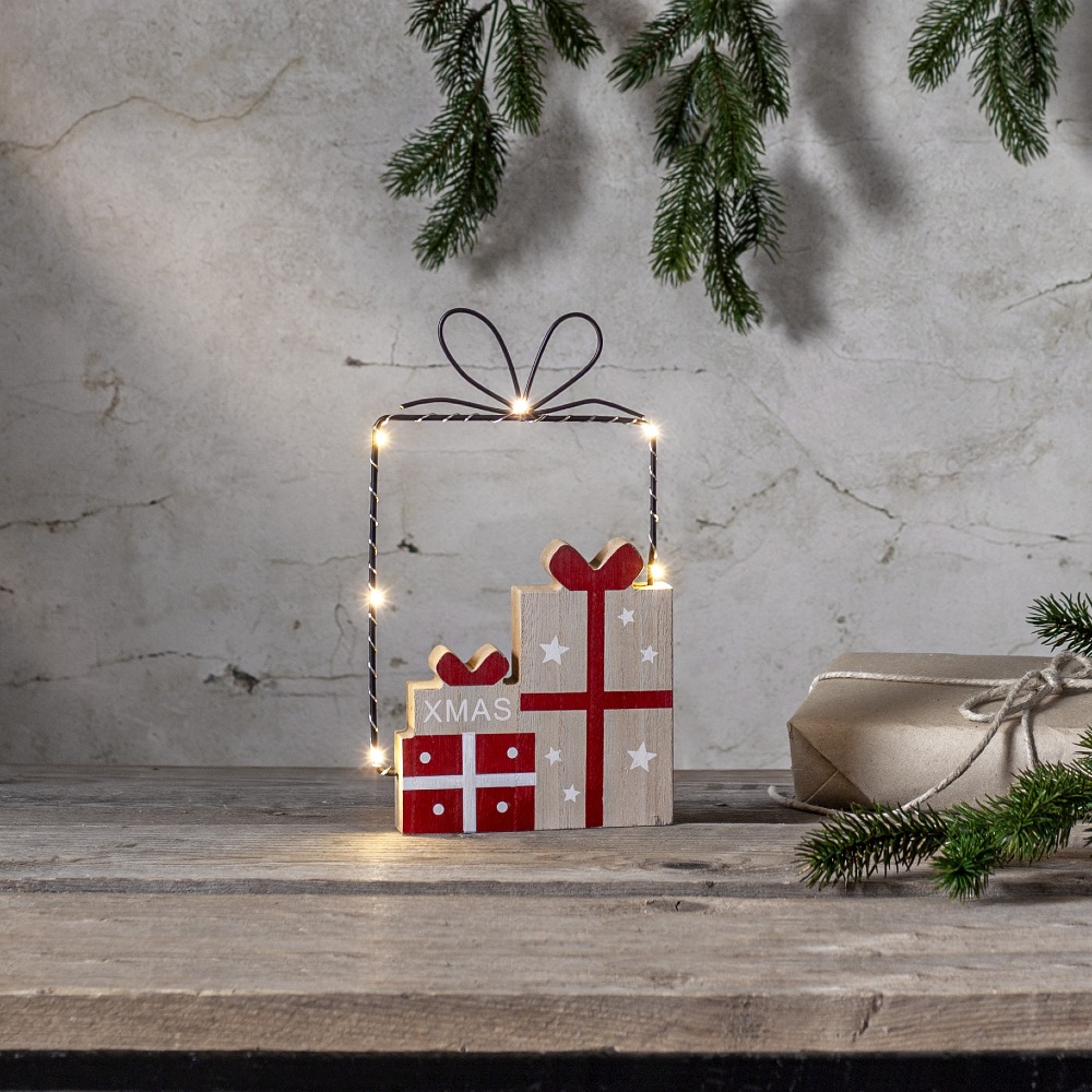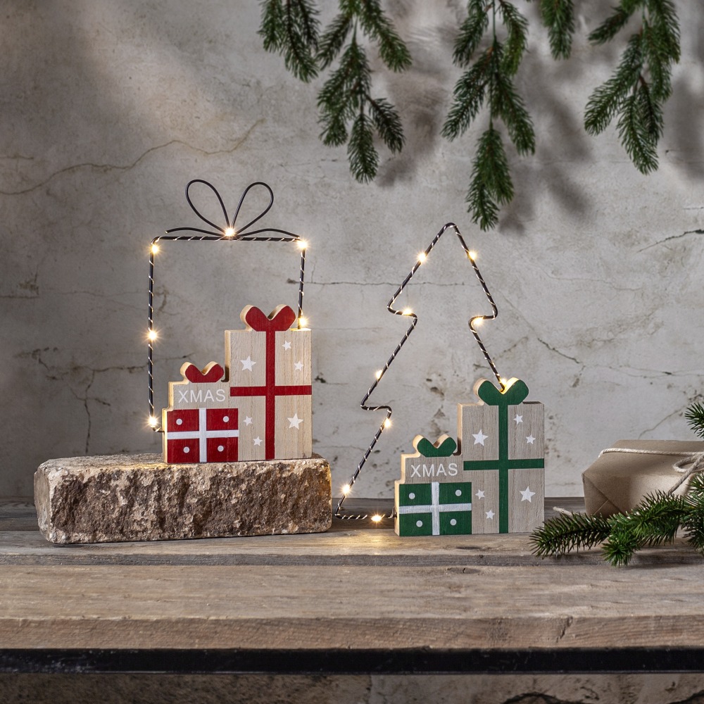 Urocza dekoracja świąteczna w kształcie prezentów to wyjątkowy dodatek, który wprowadzi do wnętrza ciepły i magiczny klimat. Metalowy kontur w formie paczki został ozdobiony drewnianymi elementami stylizowanymi na starannie zapakowane prezenty, tworząc efektowną i nowoczesną kompozycję. Całość podkreślają subtelne punkty świetlne LED, które rozświetlają dekorację delikatnym blaskiem. Idealnie prezentuje się na półce, komodzie lub w oknie. Zasilanie na baterie oraz funkcja timera sprawiają, że jest to dekoracja nie tylko estetyczna, ale i praktyczna.