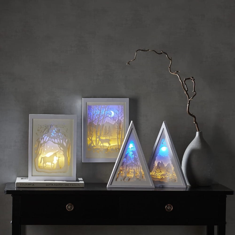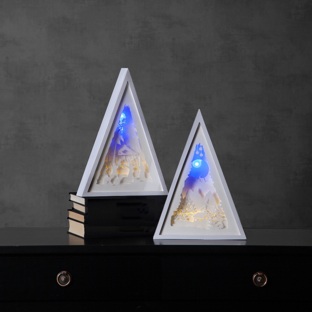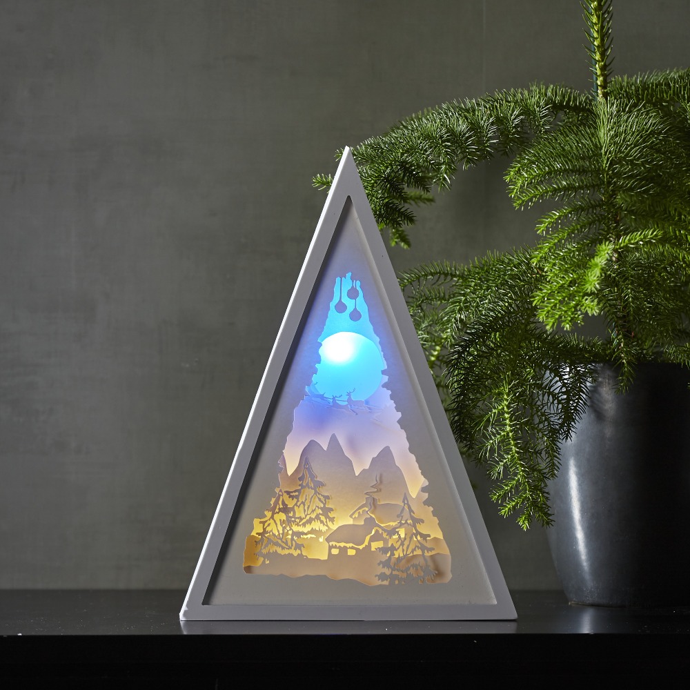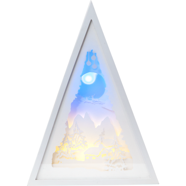 Wprowadź magiczny nastrój do swojego domu dzięki eleganckiej, trójkątnej ramce z motywem zimowego krajobrazu. Ta wyjątkowa dekoracja świąteczna, podkreślona subtelnym światłem LED, doda przytulnego uroku każdemu pomieszczeniu. Dzięki zasilaniu na 3 baterie AA możesz postawić dekorację w dowolnym miejscu – na stole, komodzie czy parapecie. Brak kabli sprawia, że jest niezwykle wygodna w użytkowaniu